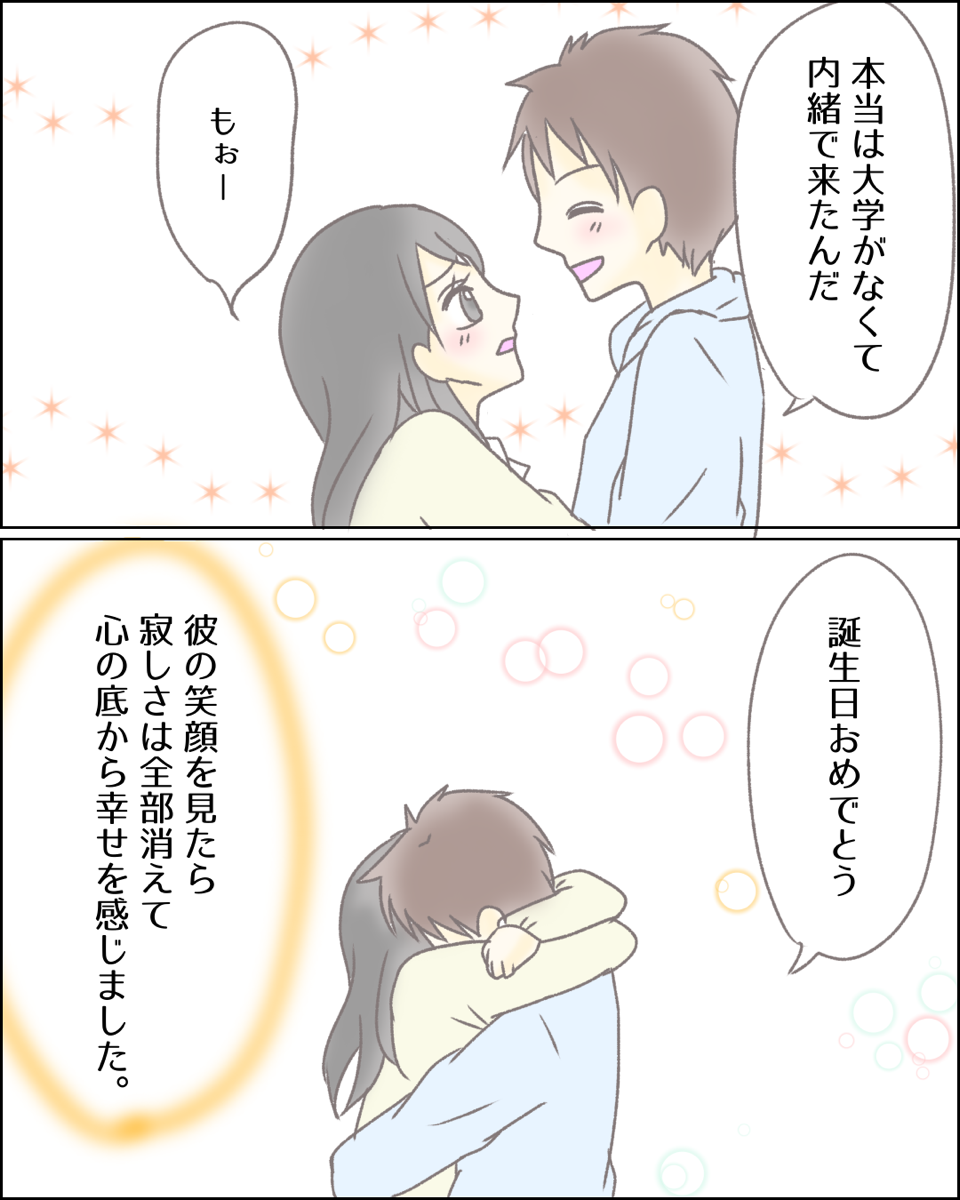 中距離恋愛中の彼氏との誕生日【Lovely漫画】 オリジナル漫画 2024年9月6日 目次 kurumiさんの作品をもっと読む! kurumiさんの作品一覧【Lovely漫画】 kurumiさんの人気作をおまとめしています! こちらのLovely漫画もおすすめ マッチングアプリとプレゼント【Lovely漫画】 年齢=彼氏いない歴の私。彼氏が欲しいとマッチングアプリを始めました!そこで出会った彼からクリスマスプレゼントをもらい…©kurumi/エピソード:M 優しさのサプライズ【Lovely漫画】 受験で忙しい彼氏の迷惑にはなりたくないから我儘は我慢してるけど、正直寂しい…。そう思っていると…。©yuzuna/エピソード:匿名 幸せな遠距離恋愛【Lovely漫画】 遠距離恋愛中の大学生。付き合って1年の記念日だけど、就活中で忙しい彼には直接会えないと思っていました…©倖/エピソード:匿名 ライター Lovely編集部 編集部レポや最新情報など皆さんの「知りたい」をお届け!よろしくお願いします♡ Related article / 関連記事 遠距離 婚約ミサンガ【Lovely漫画】 彼が沖縄のおみやげをたくさん買ってきてくれた。その中にはミサンガも。すると彼が突然驚きの言葉を!?©しのだちかこ/エピソー… 2024年11月25日 遠距離 夜の電話【Lovely漫画】 年上彼氏と中距離恋愛中の私。毎晩の電話が日課になっています。ところが、今日の電話は彼の返事が素っ気なくて…。©なつ/エピソ… 2024年8月1日 遠距離 ポケットからキュンです♡【Lovely漫画】 遠距離の彼が精一杯気持ちを伝えてくれました♡©kurumi/エピソード:ちっち 2024年10月3日 遠距離 好きな人が出来たことが無い彼を好きにさせた話【Lovely漫画】 私が好きになったバイト先の店長は、「好き」という気持ちが分からない人で…。でも絶対に振り向かせてみせる!©しのだちかこ/エ… 2025年2月12日 遠距離 包容力のある彼氏が神だった件【Lovely漫画】 女の子の日の彼氏の対応に涙…♡©倖/エピソード:ももち 2024年10月4日 遠距離 6年前の恋に落ちた日【Lovely漫画】 丁寧なミシン作業の彼に惹かれて恋をした©ぴまを/エピソード:イチハ 2025年1月14日 遠距離 同期との運命の出会い【Lovely漫画】 研修で一緒になった同期に一目惚れした私。特に進展もなく迎えた研修最終日、彼から食事に誘われて…。©マナミン/エピソード:ゆ… 2024年8月6日 遠距離 寝落ち通話で素敵な夜を【Lovely漫画】 私の日課は、遠距離恋愛中の彼との寝落ち通話です。ある日、先に寝てしまった彼との通話を繋げたままにしていたら、予想外の展開に… 2024年8月5日 遠距離 遠距離中の彼との記念日旅行で…【Lovely漫画】 記念日旅行で、彼が不思議なゲームを提案してきて…?©しのだちかこ/エピソード:このは 2024年10月10日 遠距離 リモキュン【Lovely漫画】 遠距離だから会えないのに、リモートでさえもドキッとさせてくれる彼に惚れ直しちゃった!©おはぎ/エピソード:匿名 2022年3月29日 遠距離 遠距離の覚悟【Lovely漫画】 高校で遠距離恋愛になった私たち。覚悟はしていたものの寂しくて、彼との電話中に涙が止まらなくなってしまったら…©倖/エピソー… 2024年12月20日 遠距離 私の決意【Lovely漫画】 東京と福岡で遠距離恋愛をしている私たち。ほんとはどんな時も一緒に居たいけど、こんな世の中でさらに会うのが難しくなった…。だ… 2024年9月20日 オリジナル漫画 出会いはフェリーで【Lovely漫画】 友達に会いに行くために乗った夜行フェリー。乗船前に見かけたイケメンも一緒に乗ってることがわかりドキドキ。また会えたらいいな… 2024年12月13日 遠距離 失敗した嫉妬【Lovely漫画】 チャットアプリで知り合った10歳年の差がある彼。いつも女友達と一緒の写真をいつも私に送ってくるのはなぜ…!?©サクライ/エ… 2024年8月16日 遠距離 長年の片想いに勝利した恋【Lovely漫画】 「重い。ゲームの邪魔になる」と振られた彼が忘れられなくて、彼との思い出を投稿エピソードにして気持ちを整理していた時。同い年… 2024年9月18日 遠距離 嬉し涙って出るんだ【Lovely漫画】 遠距離恋愛中の彼氏ともうすぐ付き合って1年の記念日。記念日には大好きなテーマパークに行こうねって約束をしていた…©おひつじ… 2022年3月29日 遠距離 思いがけないサプライズ【Lovely漫画】 東京と熊本で4歳年上の彼と遠距離恋愛中の私。5か月間会えない寂しさに少し負けそうになっていました。©れも/エピソード:みさ… 2025年2月4日 遠距離 不意打ちのやさしさ【Lovely漫画】 神戸と福岡で遠距離恋愛中の私たち。ある日、電話で彼と話をしていると…©しのだちかこ/エピソード:mim 2025年1月17日 遠距離 私たちの出会ったハワイ【Lovely漫画】 留学先で出会った彼。お互い惹かれ合い、付き合うことになったけれど…©どんぐり/エピソード:まる 2024年10月18日 遠距離 ある夏の出会い【Lovely漫画】 夢を追って数年前から海外に住んでいる私。ある時、一時的に日本へ帰国中、成り行きで友人の同僚と飲むことになり…©はにぃ/エピ… 2025年1月8日 1 2 3 オリジナル漫画 よかったらシェアしてね! URLをコピーしました! URLをコピ