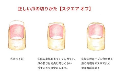 巻き爪の予防策として、正しい爪の切り方である「スクエアオフ」を覚えましょう。爪の長さを切りすぎないことがポイントです。