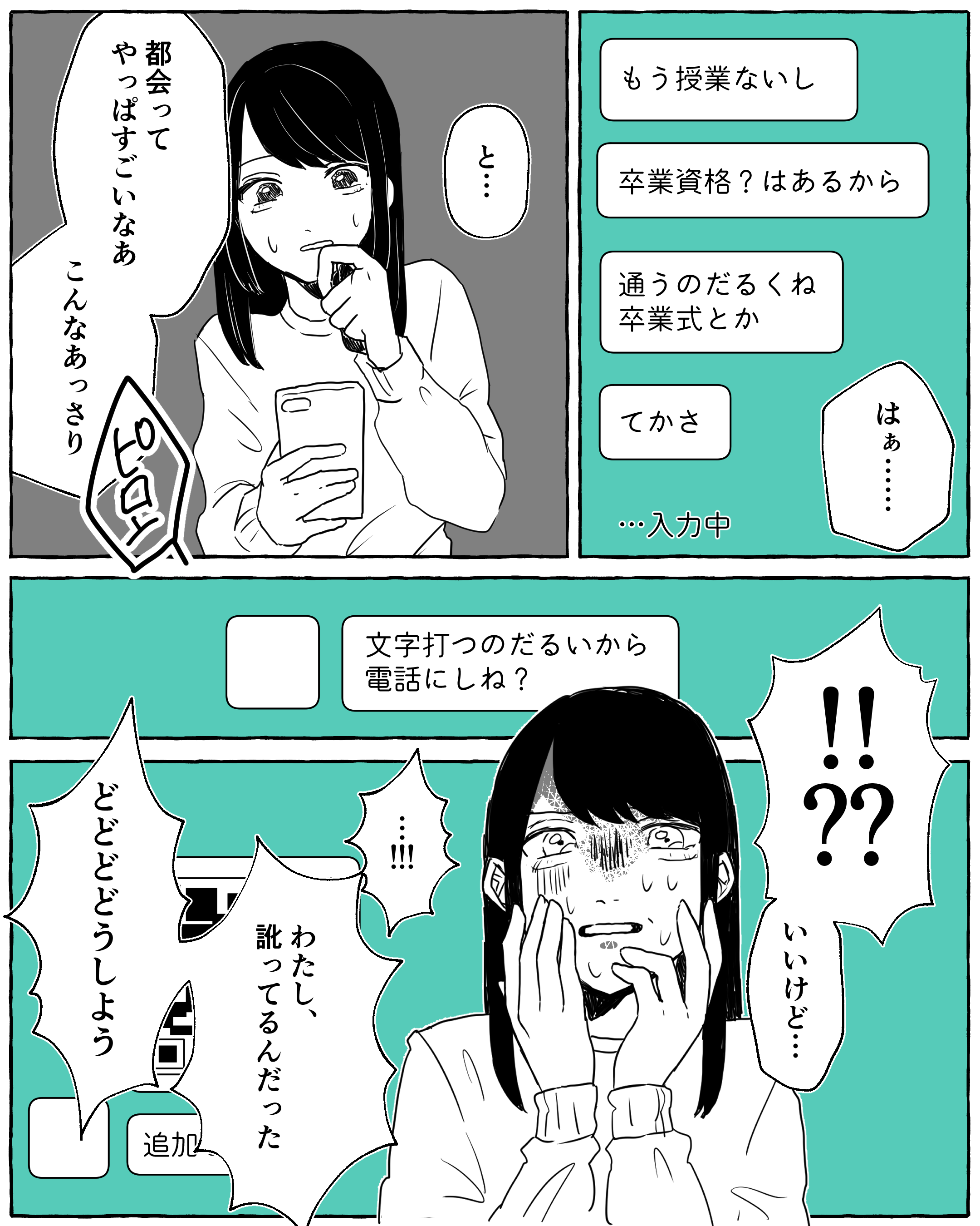 学歴コンプだけど上京してモテたい 5【山田ぽむち漫画】 オリジナル漫画 2022年3月29日 目次 ▼続きはこちら 学歴コンプだけど上京してモテたい 6【山田ぽむち漫画】 学歴コンプな私が上京してモテたい話 ©山田ぽむち ▼山田ぽむちさんの漫画一覧 山田ぽむちさん漫画一覧 同棲会議!!©山田ぽむち ▼こちらのlovely漫画もオススメ! ママ活男子の恋 1【みわ柴ちゃん漫画】 ママ活で出会った1人の女性に心を奪われていく、男子大学生のラブストーリー。(※このストーリーはフィクションです。) ©みわ柴ちゃん 恋する季節に ー春ー 1【beth(ベス)漫画】 SNSで大人気beth(ベス)さんが送る胸キュン間違いなしの創作ストーリー!呼春ちゃん編♡ ©beth(ベス) ライター 山田ぽむち Instagram[@___dokkoisho___]にて、陰キャ彼氏との日常や、自分の過去の失敗などを漫画にしています。 Related article / 関連記事 オリジナル漫画 メンヘラ彼氏にサヨナラ【Lovely漫画】 ©みんみ 2022年3月29日 オリジナル漫画 年下イケメン彼氏に翻弄されるオンナの毎日#3【Lovely漫画】 ©みんみ 2022年3月29日 オリジナル漫画 2人暮らしのゆる家事日記~気まぐれ旦那の献立作りの巻き~後編【Lovely漫画】 ©みんみ 2022年3月29日 オリジナル漫画 年下イケメン彼氏に翻弄されるオンナの毎日#1【Lovely漫画】 ©みんみ「初めての○○の話 前編」 2022年3月29日 オリジナル漫画 年下イケメン彼氏に翻弄されるオンナの毎日#2【Lovely漫画】 ©みんみ「初めての○○の話 後編」 2022年3月29日 1 2 オリジナル漫画 よかったらシェアしてね! URLをコピーしました! URLをコピーしました! 【夢占い】彼女に浮気された夢の意味13選|もしかして予知夢?心理状態も解説 | plush 恋愛相談はどこで?相談所・掲示板・アプリでする?男友達にする?