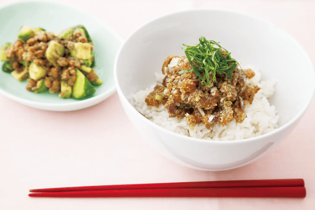 ③ボウルにアボカド、きゅうり、納豆と②、かつお節、しょうゆ、すりごまを入れてよく和える。味をみて足りないようなら、しょうゆ(分量外)を加える。器に盛り付け、すりごまを振る。
