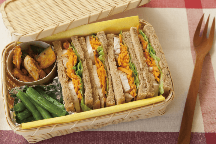 ③パンの片面にマヨネーズを塗り、水気をふき取ったレタス、②のにんじん、①で作った鶏ハムを薄切りにして挟む。食べやすい大きさに切る。