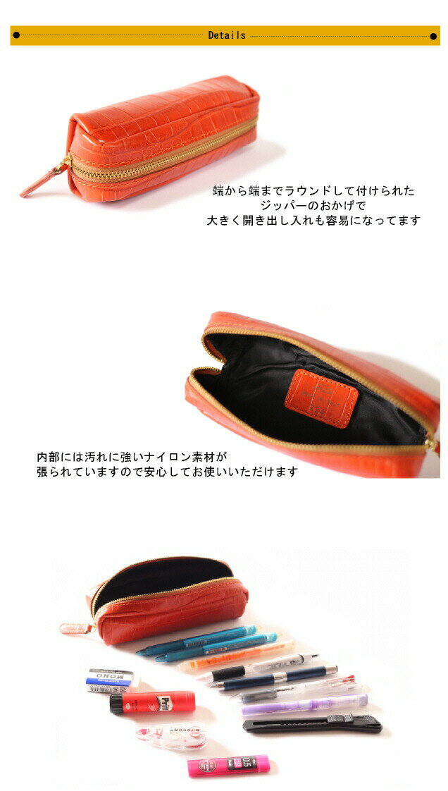 felisiのペンケースにはクロコダイル模様のエンボスレザーが使用され、見た目のおしゃれ度はまさにハイクラス。マチが広く、ペンが15本入るサイズなので、仕事道具が多い人へのプレゼントに向いています。