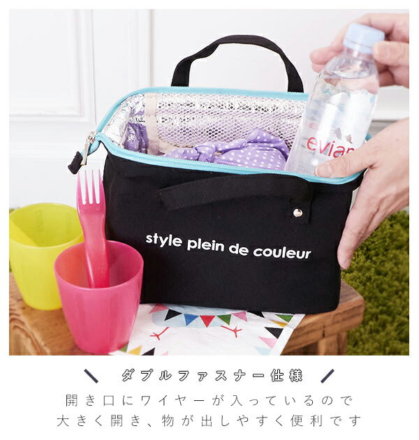 内側は保冷シートになっており、保冷剤を入れるポケットも。弁当箱と、立てたペットボトルを一緒に入れられる大きさです。出し入れ口は一箇所のホックで留める形で、お弁当や物の出し入れがスムーズにできます。