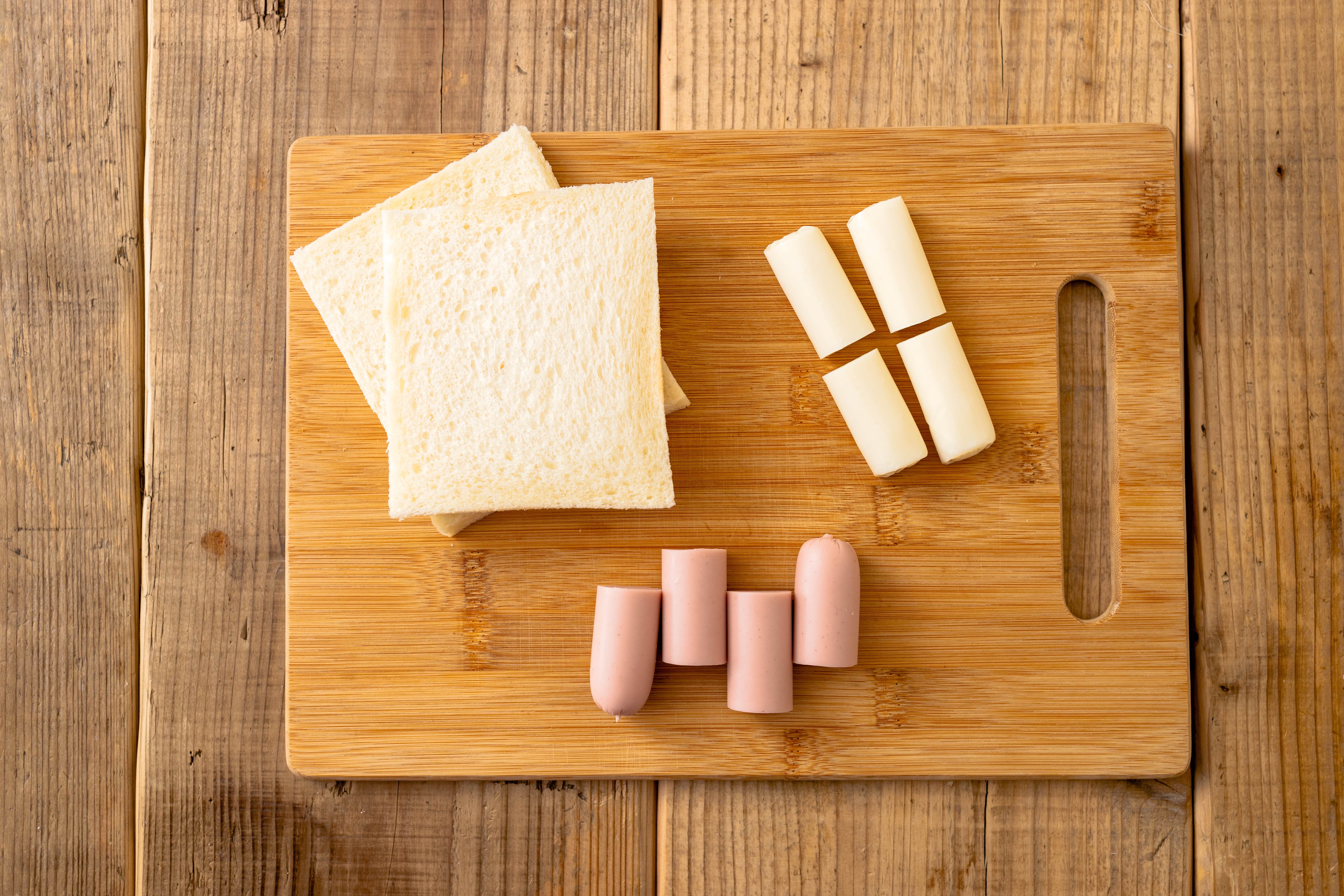 ①「おさかなのソーセージ」とさけるチーズ、食パンの準備をします。