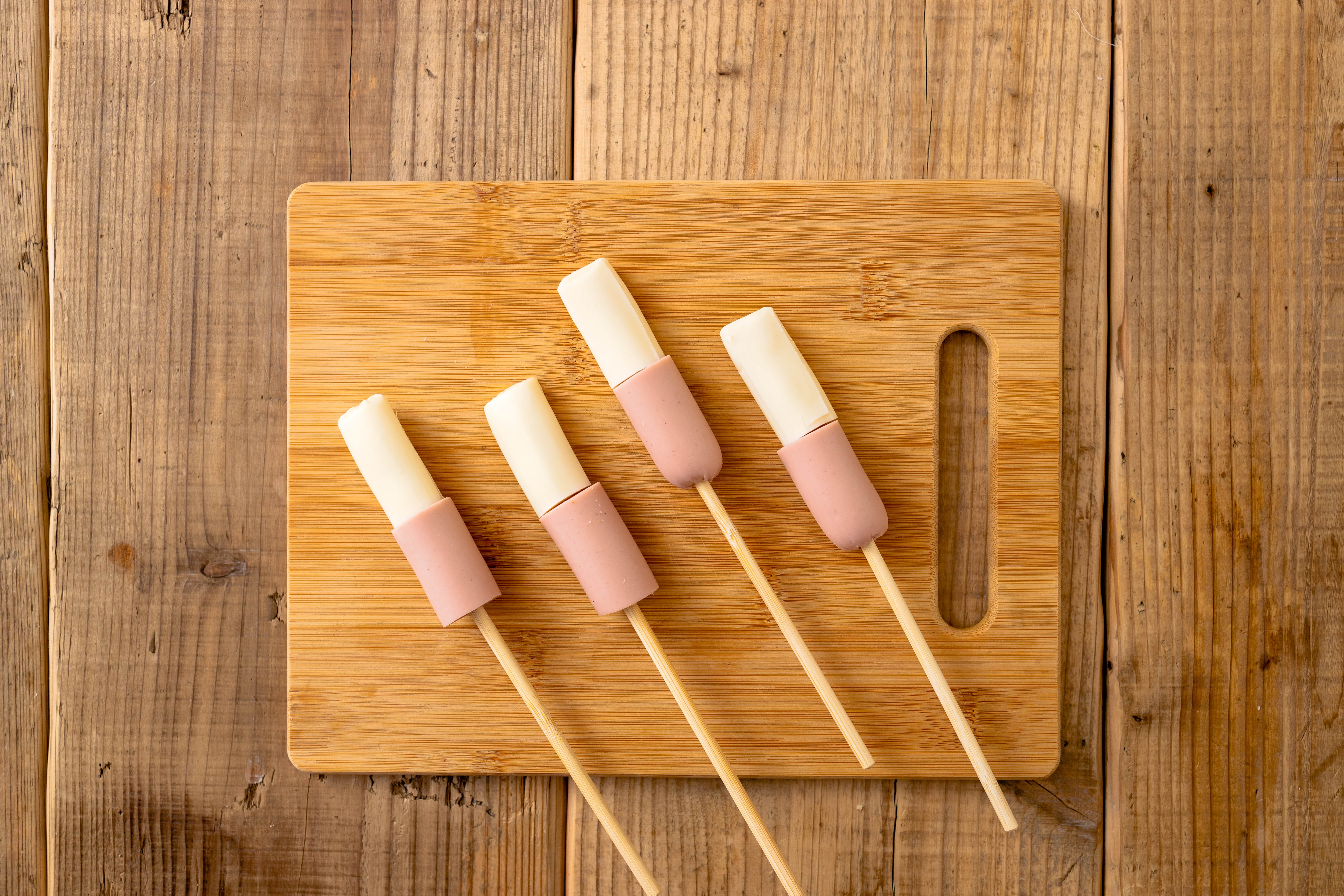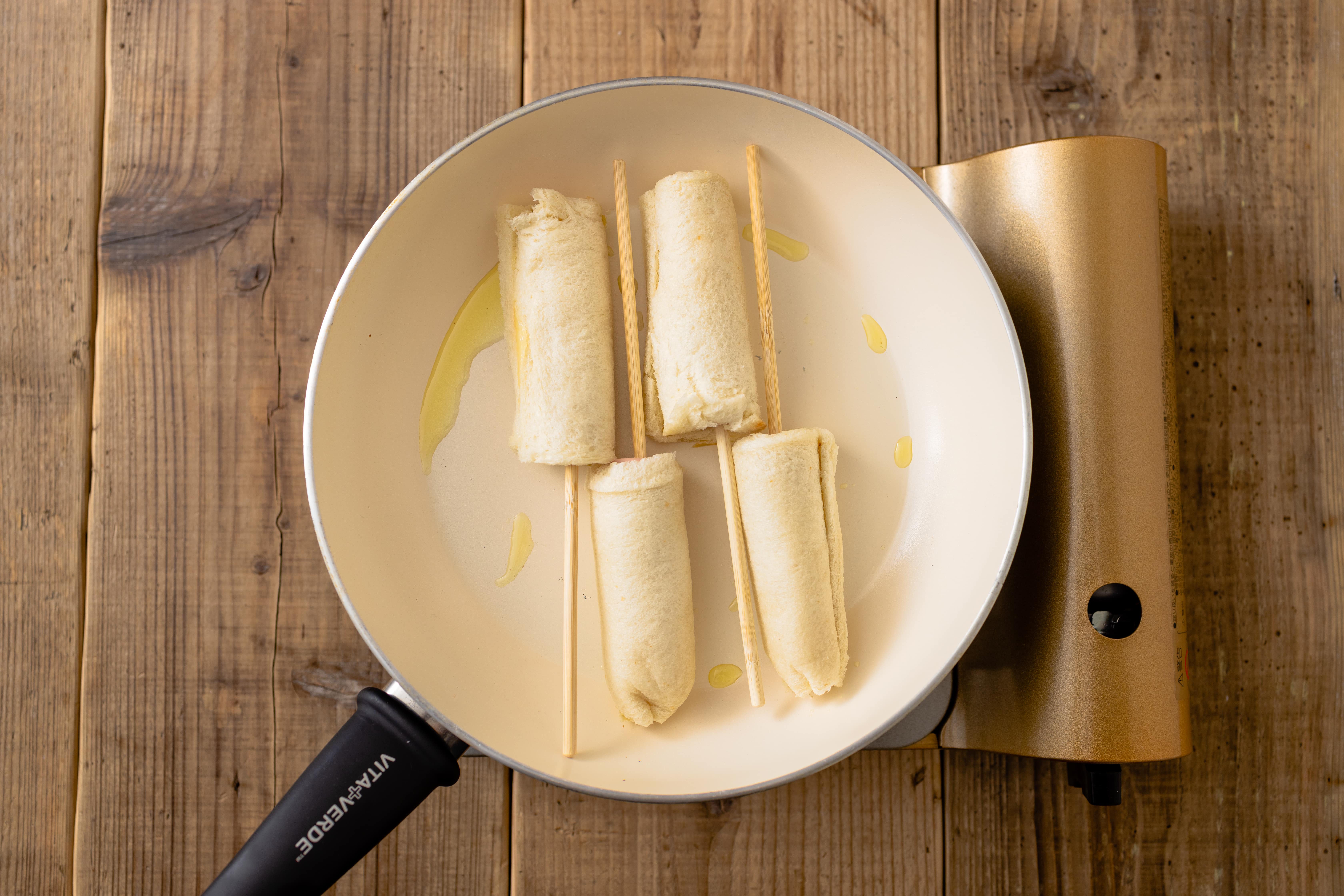 ハットグは、クシを刺したソーセージに生地を絡めて油で揚げるのが一般的ですが、今回は食パンと「おさかなのソーセージ」で、揚げずにつくるハットグ風に仕上げました。