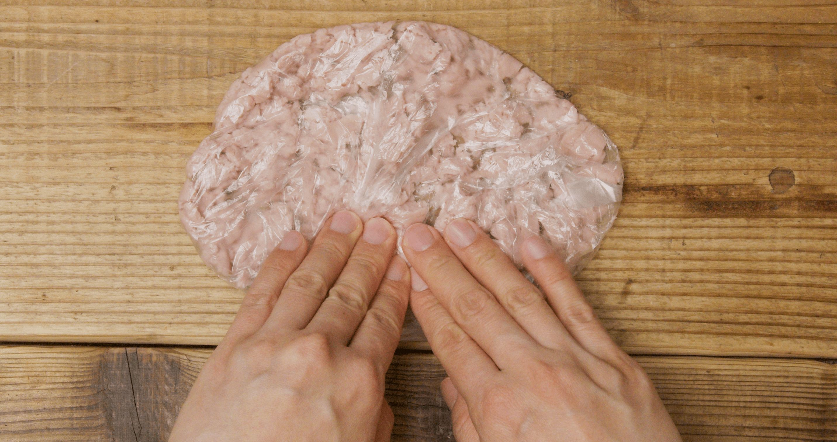 食パンは耳を切り落とし、ラップをかぶせて手のひらなどで押しつぶして平らにします。