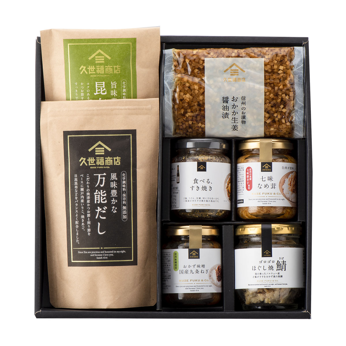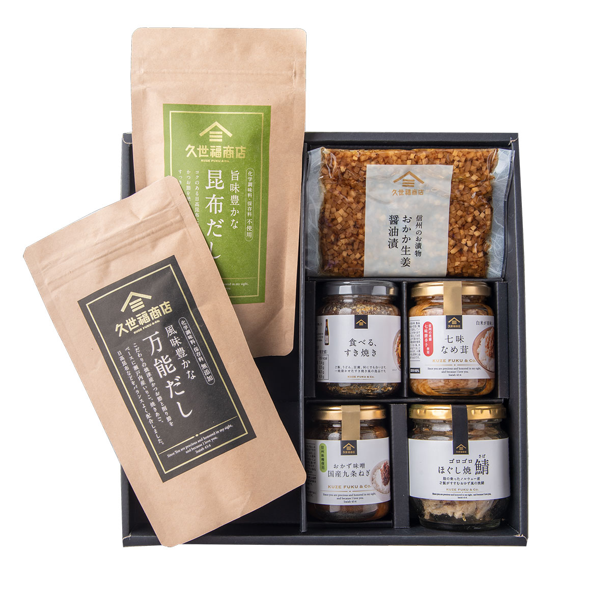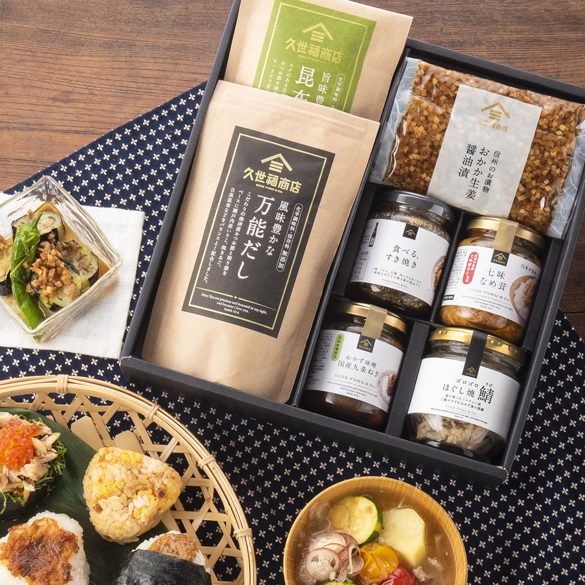 【ごはんのおともセット】は、「旨味豊かな昆布だし」「風味豊かな万能だし」「信州のお漬物 おかか生姜醤油漬」「七味なめ茸」「食べる、すき焼き」「おかず味噌 国産九条ねぎ」「ゴロゴロほぐし焼鯖」がセットになったギフトです。