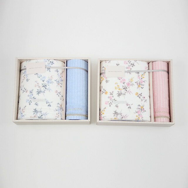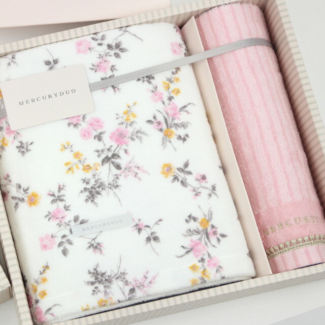 女性に大人気のアパレルブランド「マーキュリーディオ」のタオルセットです。大人フレンチの花柄のバスタオルと、刺繍入りのストライプ柄のウォッシュタオルの2枚入り。