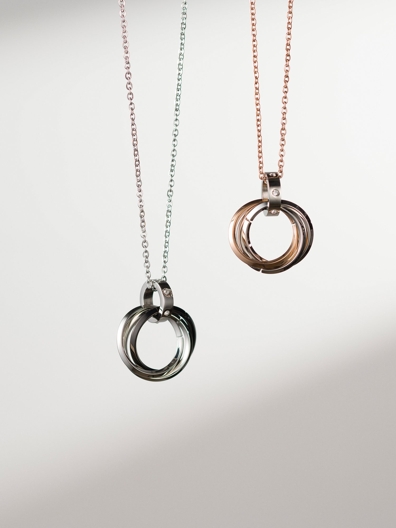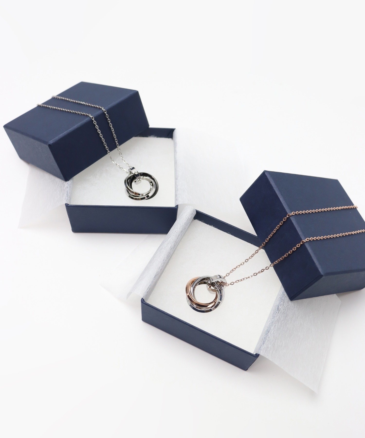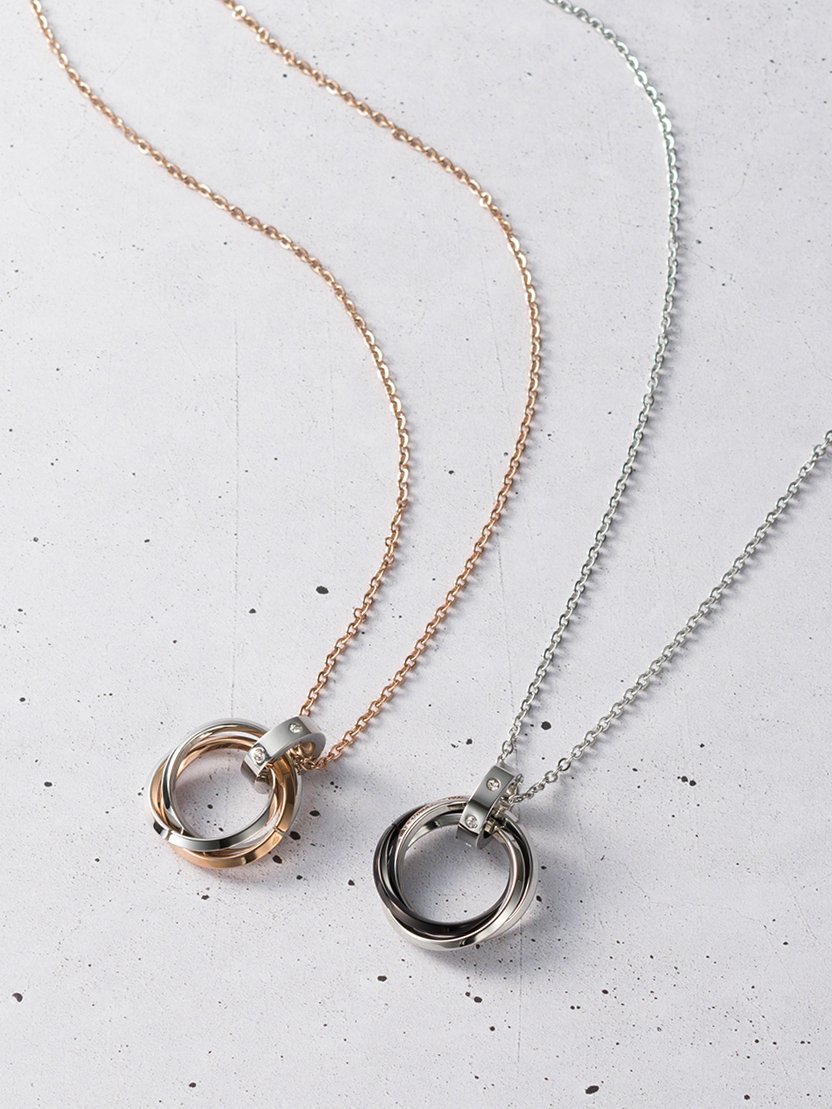 ガンメタカラーとローズカラーのペアネックレスは、それぞれ男性らしさと女性らしさを引き立ててくれる色合いです。リングの内側には、お守りとなる格言が刻まれています。