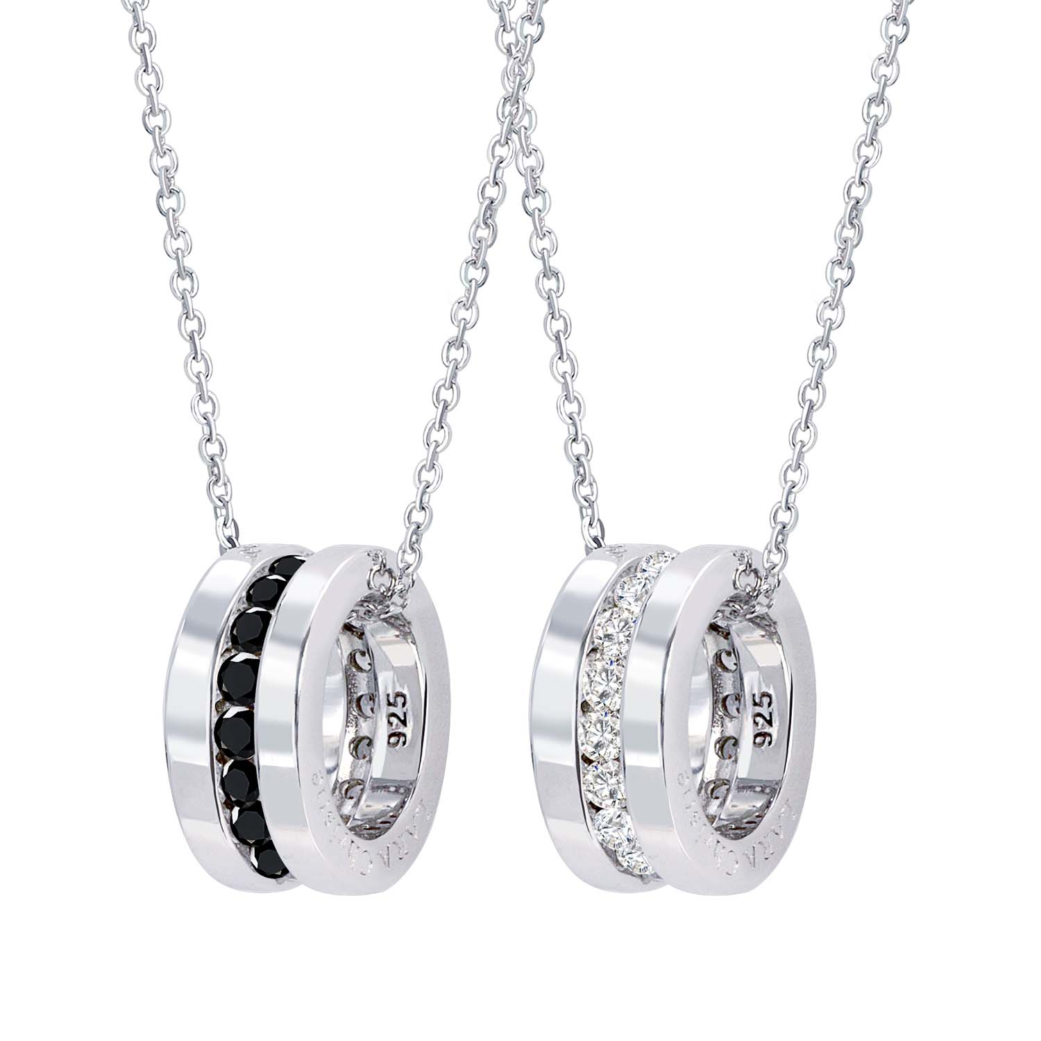 リング型のペアネックレスは、メンズサークルの中にレディースサークルを入れると文字が浮かび上がるデザインです。カップルにぴったりな、「EVEN MOMENT WITH YOU(どんな時もいつも一緒)」という言葉が刻まれています。