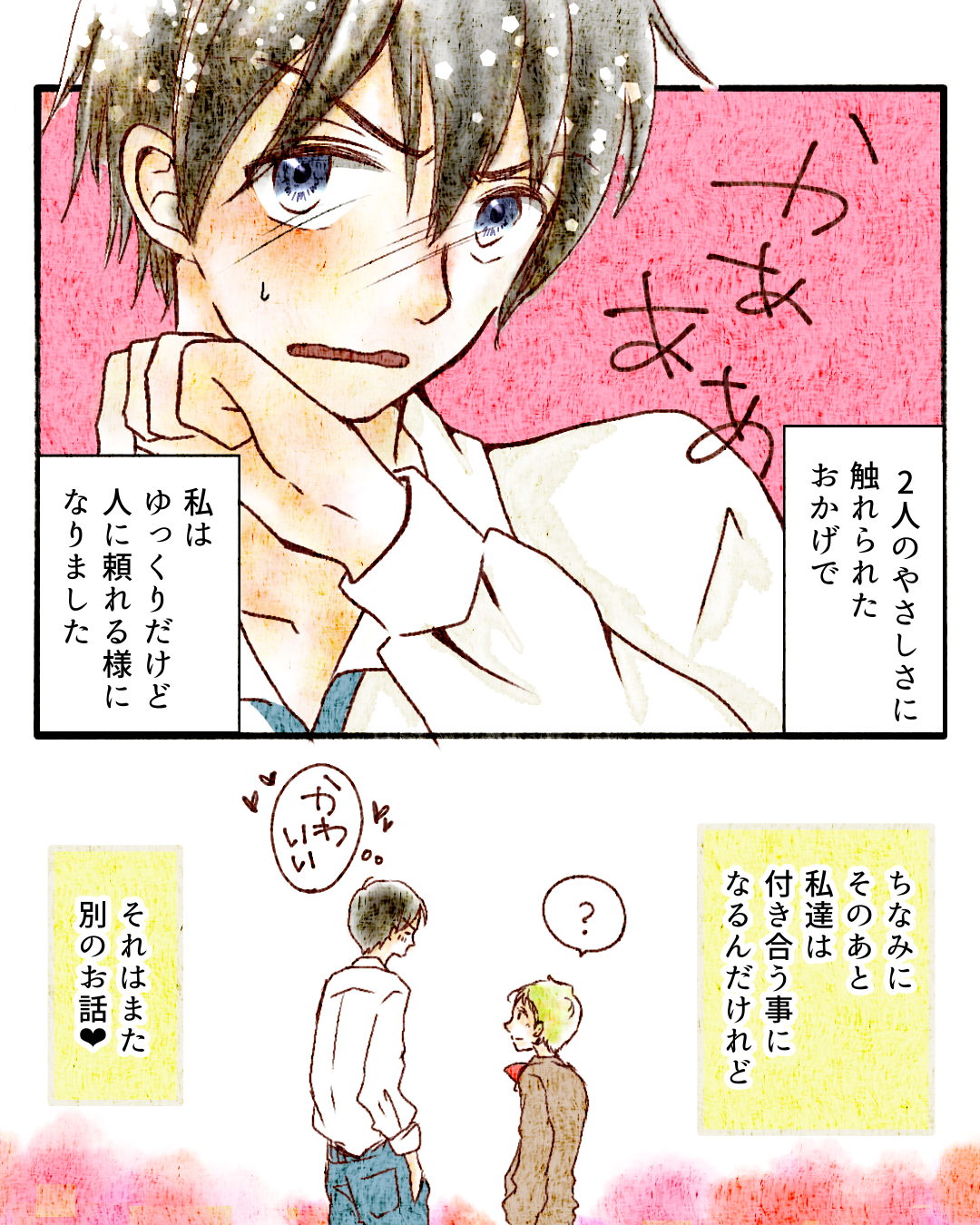 ホントのキモチ【Lovely漫画】 オリジナル漫画 2024年7月30日 目次 あやたきくこさんの作品をもっと読む! あやたきくこさんの作品一覧【Lovely漫画】 あやたきくこさんの人気作をおまとめしています! こちらのLovely漫画もおすすめ! いつも温かな人【Lovely漫画】 自分の事よりも相手を想う、優しい性格の彼氏とのエピソードです。©on/エピソード:にこちゃん もしかしたら好きだったのかな【Lovely漫画】 今も思い出す同級生の彼。あれは恋だったのかな…。©倖/エピソード:えだ豆 ふたりのなれそめ 0【まつり漫画】 まつりとにをくんの、出会いのおはなし ©まつり ライター Lovely編集部 編集部レポや最新情報など皆さんの「知りたい」をお届け!よろしくお願いします♡ Related article / 関連記事 オリジナル漫画 メンヘラ彼氏にサヨナラ【Lovely漫画】 ©みんみ 2022年3月29日 オリジナル漫画 年下イケメン彼氏に翻弄されるオンナの毎日#3【Lovely漫画】 ©みんみ 2022年3月29日 オリジナル漫画 2人暮らしのゆる家事日記~気まぐれ旦那の献立作りの巻き~後編【Lovely漫画】 ©みんみ 2022年3月29日 オリジナル漫画 年下イケメン彼氏に翻弄されるオンナの毎日#1【Lovely漫画】 ©みんみ「初めての○○の話 前編」 2022年3月29日 オリジナル漫画 年下イケメン彼氏に翻弄されるオンナの毎日#2【Lovely漫画】 ©みんみ「初めての○○の話 後編」 2022年3月29日 1 2 3 オリジナル漫画 よかったらシェアしてね! URLをコピーしました! URLをコピーしました! バイト先の人が〇〇をしていた7【稲漫画】 よく笑う女性は男性からモテる!その理由を解説します