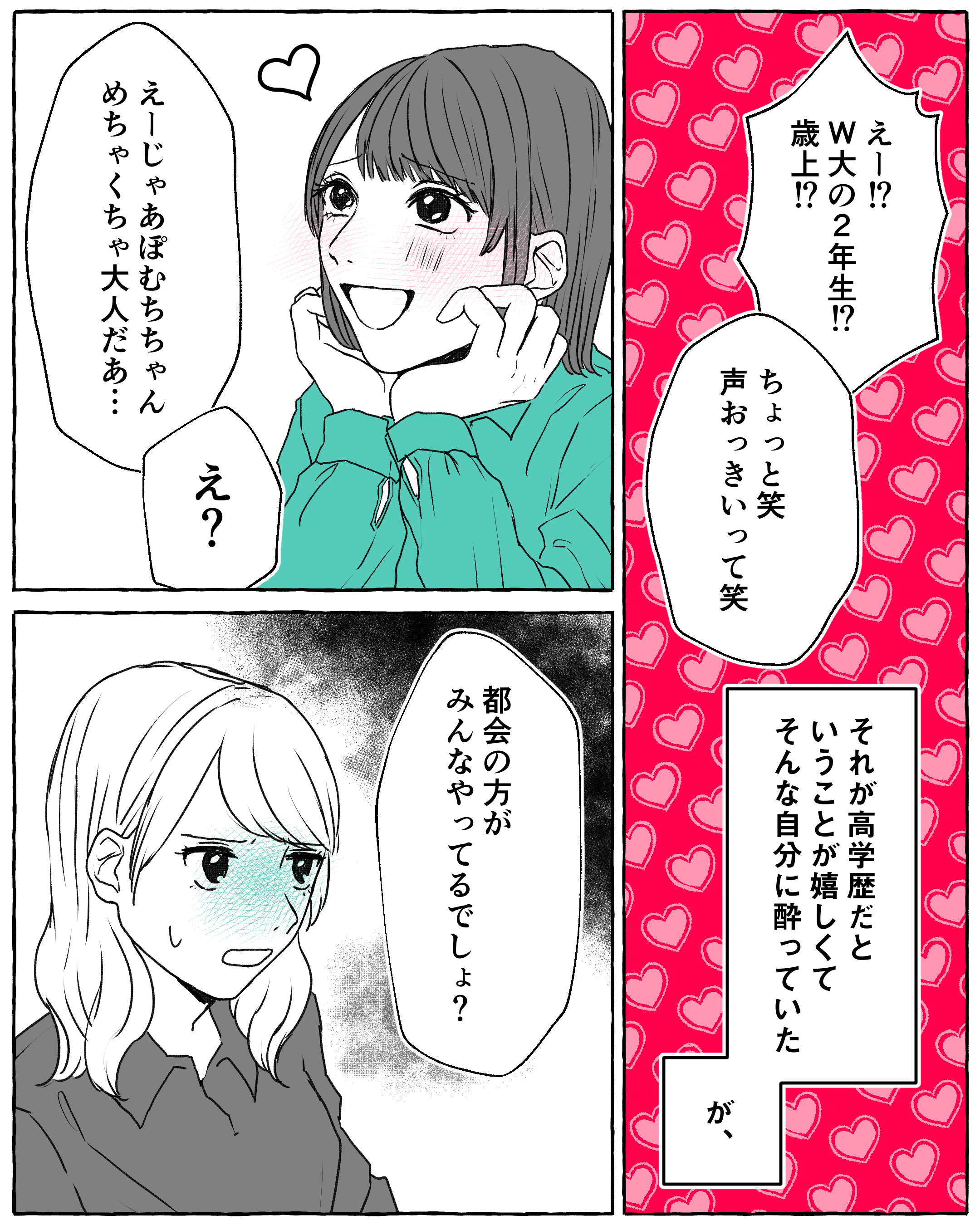 学歴コンプが上京したら泥沼にハマった話 3【山田ぽむち漫画】 オリジナル漫画 2022年3月29日 ▼前回のお話はこちら 学歴コンプが上京したら泥沼にハマった話 2【山田ぽむち漫画】 学歴コンプな私が上京したら泥沼にハマった話 ©山田ぽむち 目次Related article / 関連記事 オリジナル漫画 メンヘラ彼氏にサヨナラ【Lovely漫画】 ©みんみ 2022年3月29日 オリジナル漫画 年下イケメン彼氏に翻弄されるオンナの毎日#3【Lovely漫画】 ©みんみ 2022年3月29日 オリジナル漫画 2人暮らしのゆる家事日記~気まぐれ旦那の献立作りの巻き~後編【Lovely漫画】 ©みんみ 2022年3月29日 オリジナル漫画 年下イケメン彼氏に翻弄されるオンナの毎日#1【Lovely漫画】 ©みんみ「初めての○○の話 前編」 2022年3月29日 オリジナル漫画 年下イケメン彼氏に翻弄されるオンナの毎日#2【Lovely漫画】 ©みんみ「初めての○○の話 後編」 2022年3月29日 1 2 オリジナル漫画 よかったらシェアしてね! URLをコピーしました! URLをコピーしました! 【夢占い】彼女に浮気された夢の意味13選|もしかして予知夢?心理状態も解説 | plush 恋愛相談はどこで?相談所・掲示板・アプリでする?男友達にする?