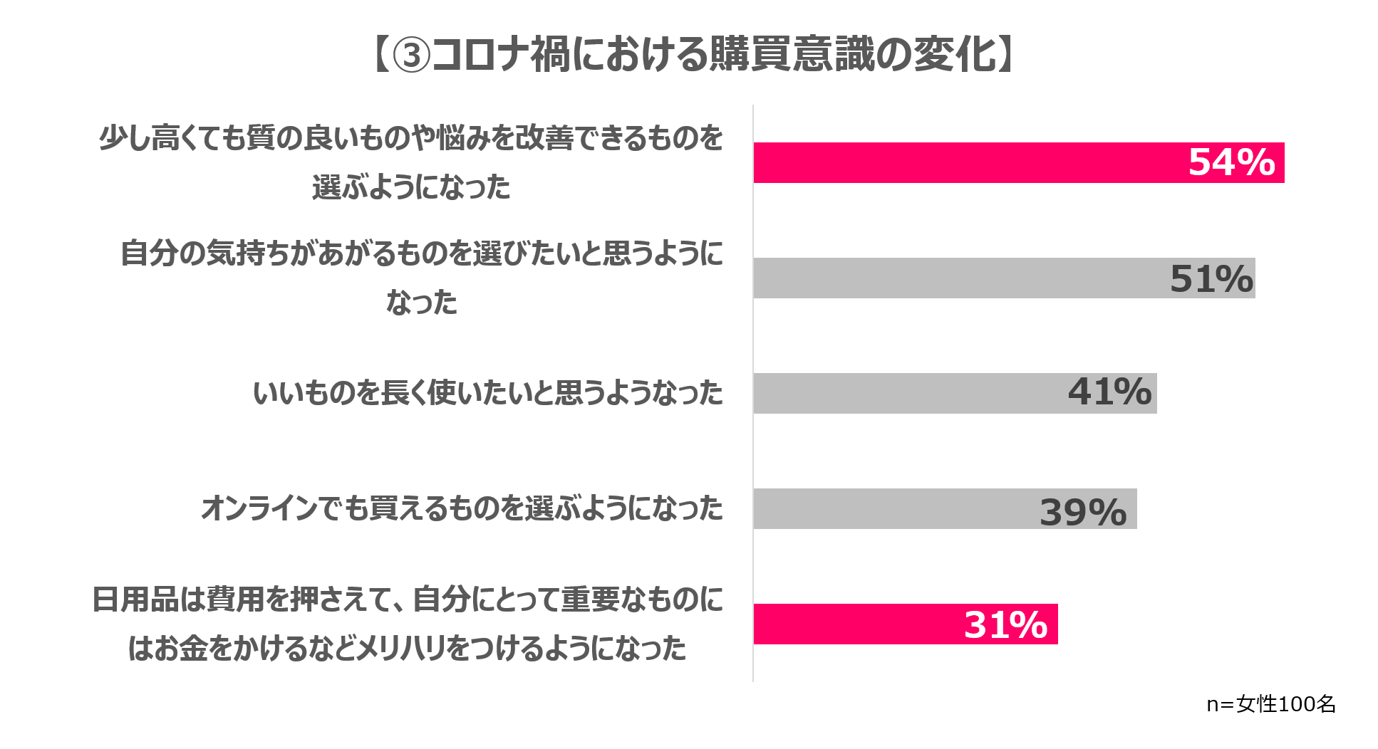 さらに、「自分にとって重要なものにはお金をかけるなど、メリハリをつけるようになった(31.1%)」という意見も見られ、「ホンモノ志向」な消費傾向に変化していることがわかります。