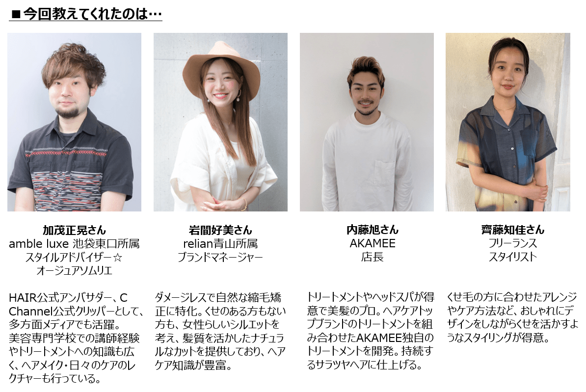 そこで、くせ毛悩みを解決するポイントを4名の美容師・スタイリストの方にお話をお伺いしました。