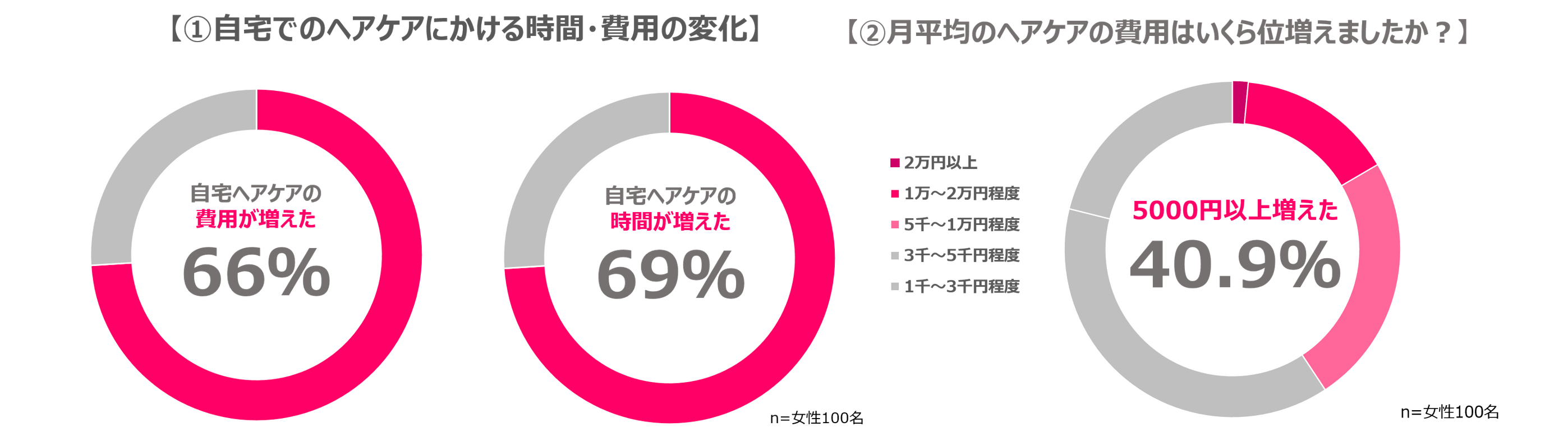 自宅でのヘアケアに対して時間・費用ともに約 7 割が増えたと回答し、費用については「月平均 5000 円以上増加した」と回答した人が約4割。