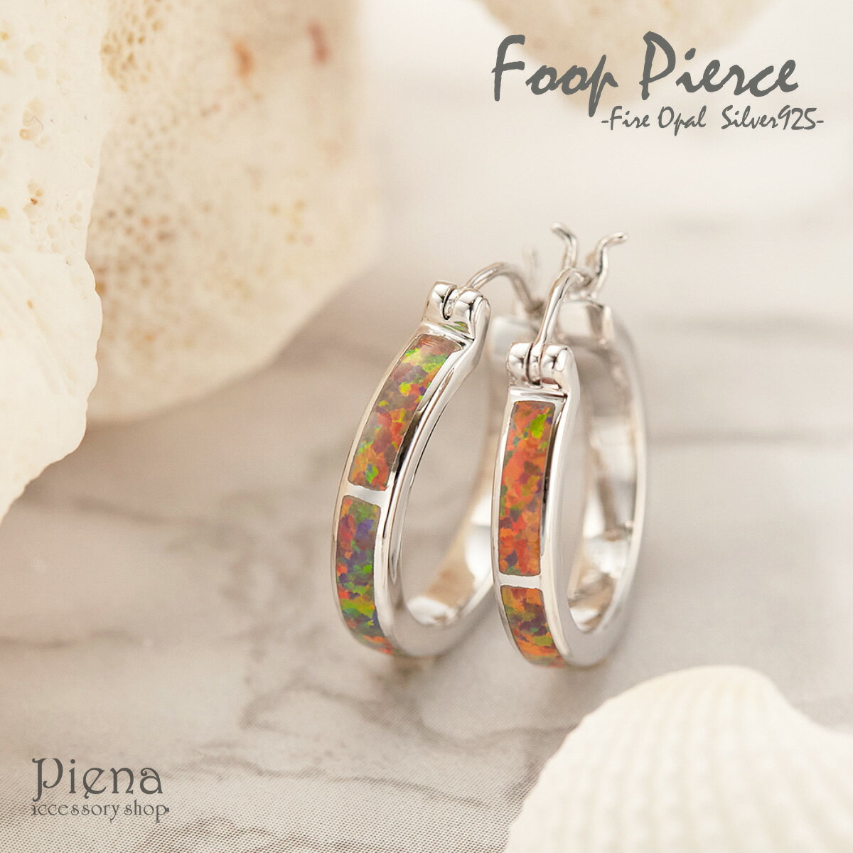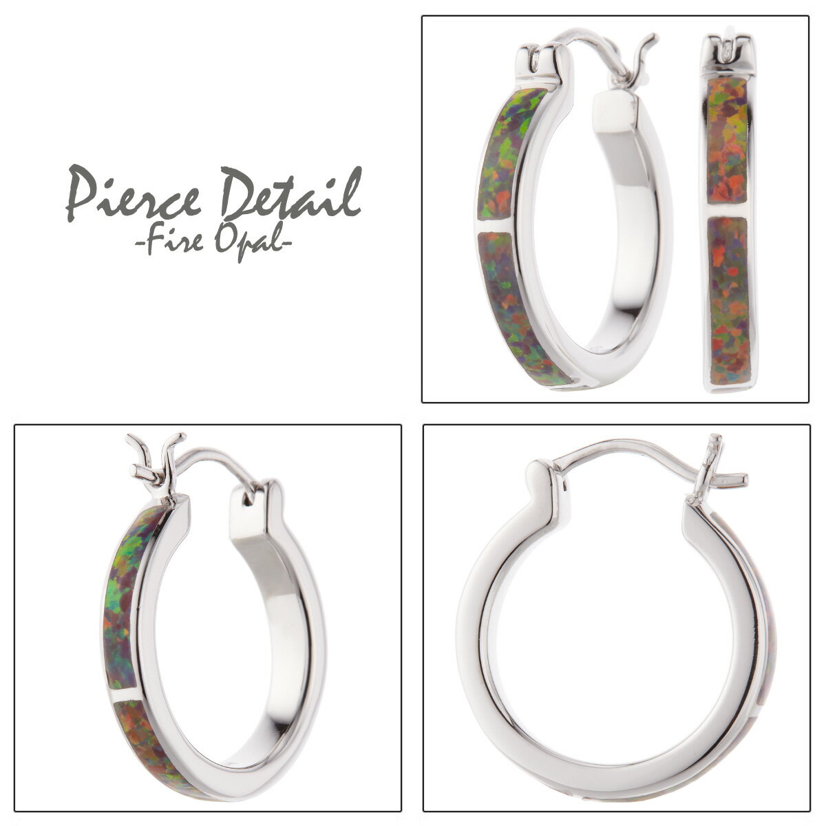 シルバー925にファイアオパールをあしらったフープピアス。ファイアオパールとはオパールの一種で、角度によって色が変化する遊色効果があるもののこと。不思議な色合いで目を引きます。
