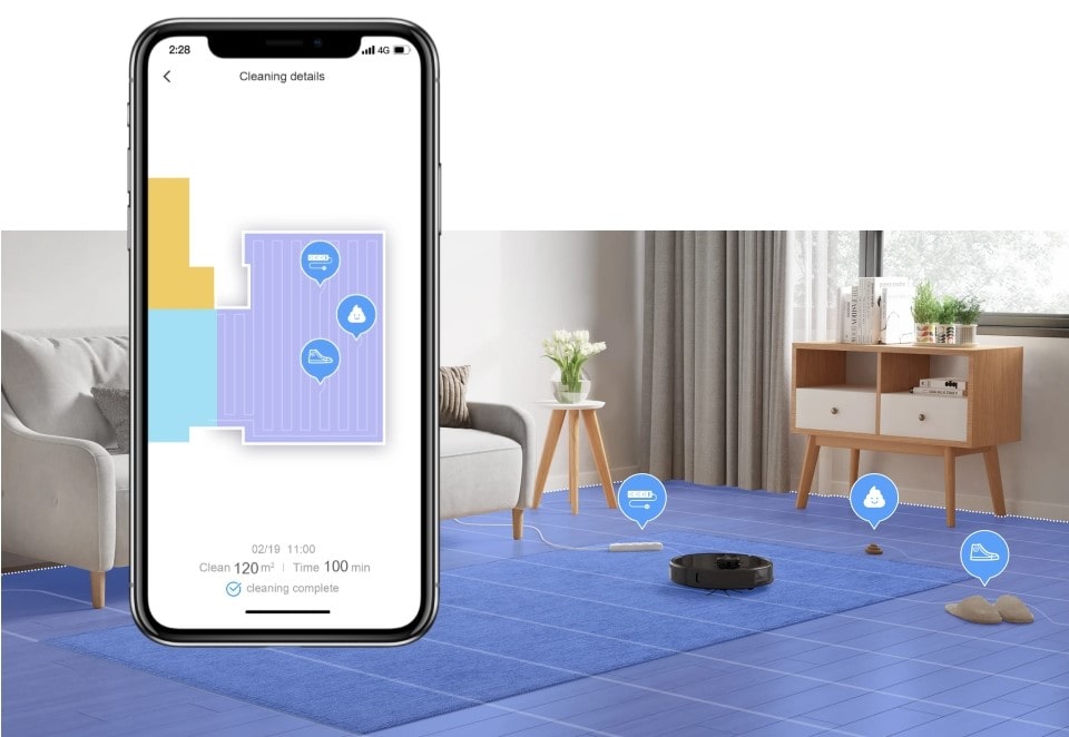 2眼カメラ搭載で回避性能がアップ。片づけ忘れた服や物、電源タップなどを巻き込むことなく回避できるため、自分や家族の身支度で精一杯の朝でも気兼ねなく動かせます。