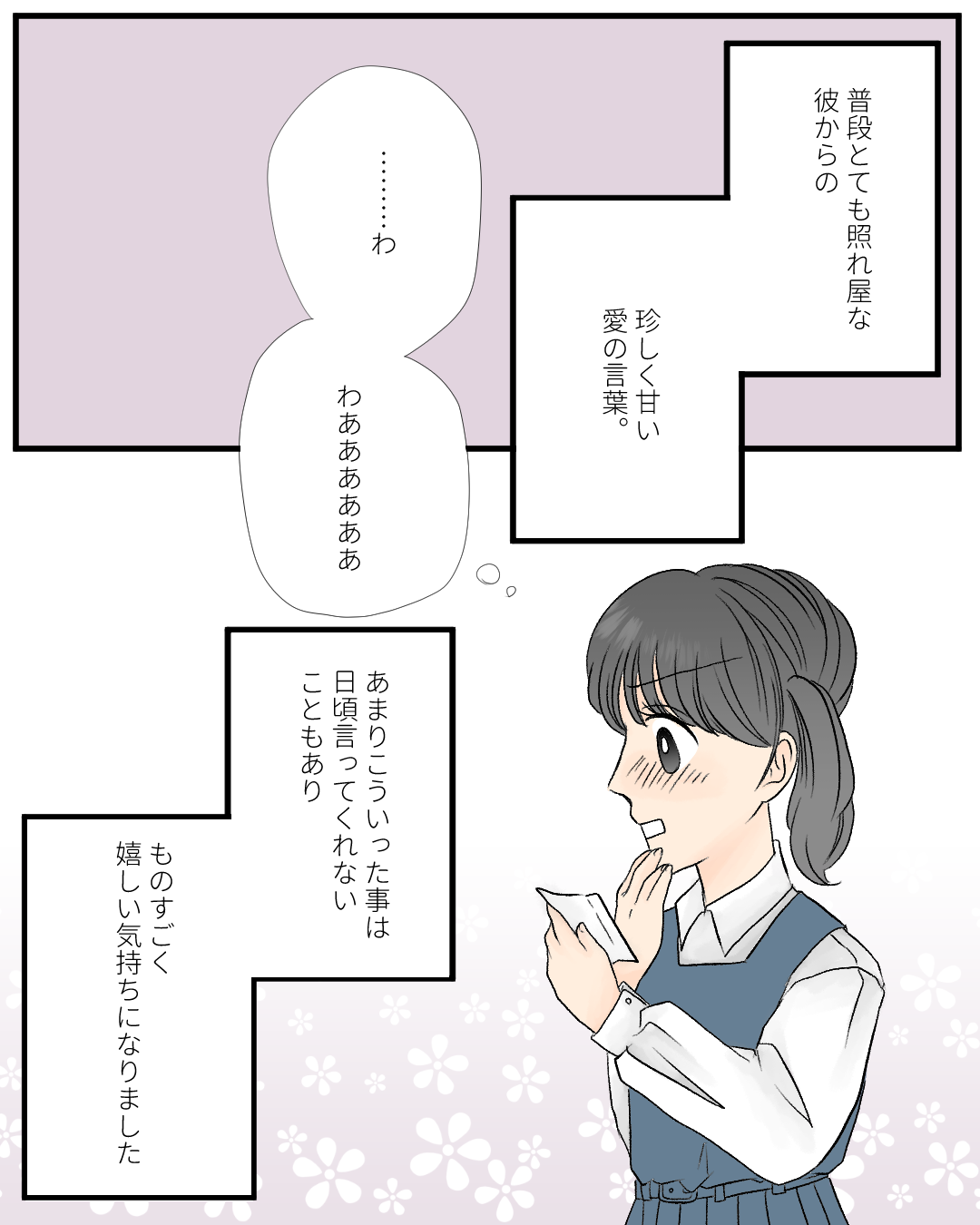 一途な彼氏の愛情表現【Lovely漫画】 オリジナル漫画 2022年3月29日 目次 こちらのLovely漫画もおすすめ! 普段からは想像できない彼の姿【Lovely漫画】 普段ツンツンな彼の甘さMAXな対応とは!?©おはぎ/エピソード:李々 雨の日は、二人の距離が近くなる【Lovely漫画】 片思い相手の彼と偶然二人きりに。恋バナをはぐらかされたと思ったら、突然…彼が近付いてきて…!©ちビ/エピソード:Baby ドキドキした毎日【Lovely漫画】 みんなといる時は悪ふざけが多く、問題児という感じの彼。でも1人の時は優しく消極的で人見知りな彼に惹かれ…©しろみ/エピソード:聖菜 照れ屋な私たちの初々しい恋物語【Lovely漫画】 彼も私も超恥ずかしがり屋…。ある日、彼が勇気を出して…?!©倖/エピソード:そーさん ライター Lovely編集部 編集部レポや最新情報など皆さんの「知りたい」をお届け!よろしくお願いします♡ Related article / 関連記事 オリジナル漫画 メンヘラ彼氏にサヨナラ【Lovely漫画】 ©みんみ 2022年3月29日 オリジナル漫画 年下イケメン彼氏に翻弄されるオンナの毎日#3【Lovely漫画】 ©みんみ 2022年3月29日 オリジナル漫画 2人暮らしのゆる家事日記~気まぐれ旦那の献立作りの巻き~後編【Lovely漫画】 ©みんみ 2022年3月29日 オリジナル漫画 年下イケメン彼氏に翻弄されるオンナの毎日#1【Lovely漫画】 ©みんみ「初めての○○の話 前編」 2022年3月29日 オリジナル漫画 年下イケメン彼氏に翻弄されるオンナの毎日#2【Lovely漫画】 ©みんみ「初めての○○の話 後編」 2022年3月29日 1 2 オリジナル漫画 よかったらシェアしてね! URLをコピーしました! URLをコピーしました! 【夢占い】彼女に浮気された夢の意味13選|もしかして予知夢?心理状態も解説 | plush 恋愛相談はどこで?相談所・掲示板・アプリでする?男友達にする?