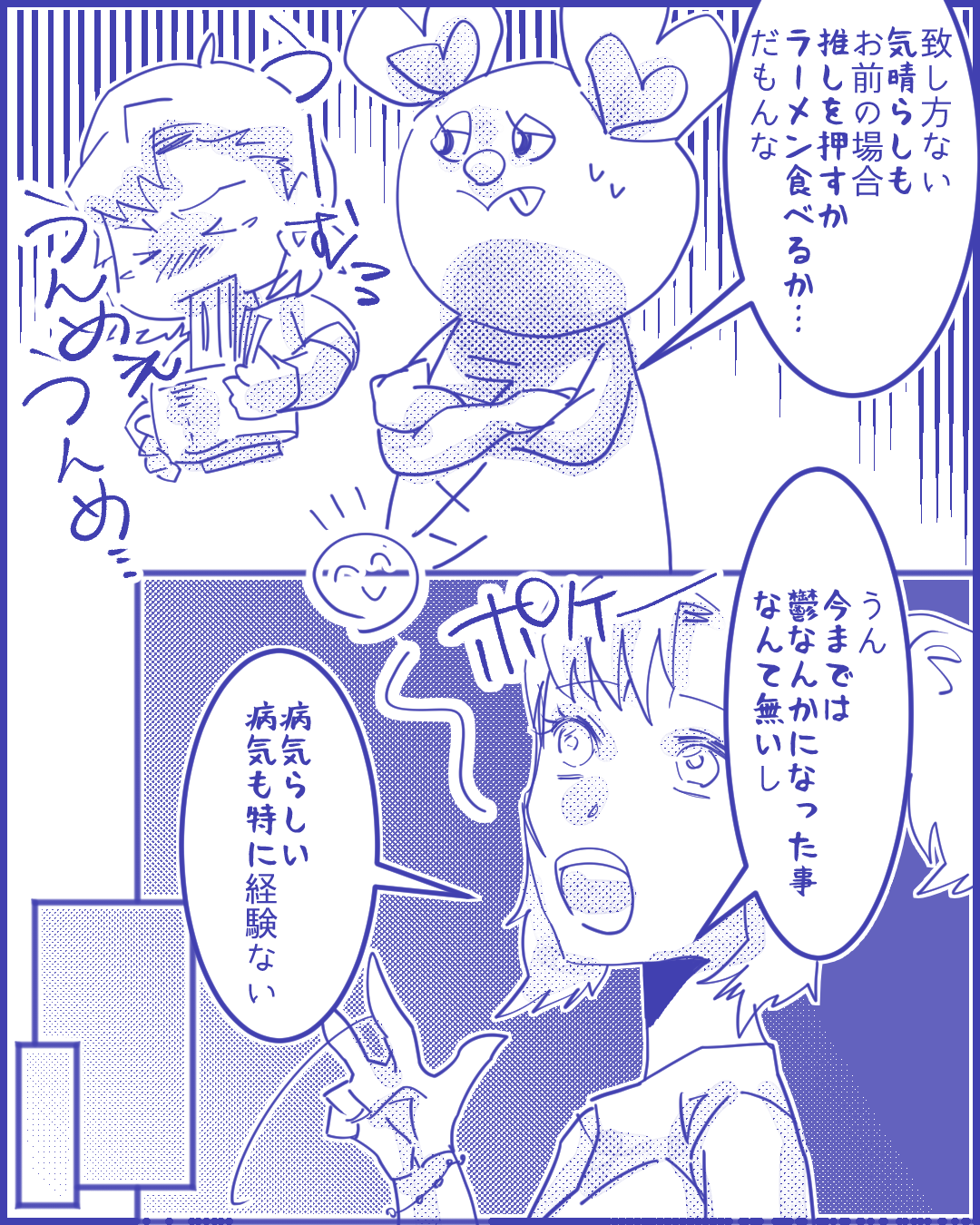 バリキャリクール美女と推し活&手抜き料理が楽しみなズボラ女子2つの顔を持つ、純(じゅん)は自称「健康オタクのカップラーメンの妖精」と共同生活中。ある日、大好きなカップラーメンが食べれなくなっている純を発見!見かねたメンメンが代替麺アレンジを教えてくれた。©ゆに