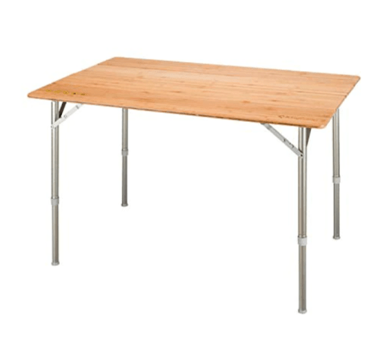 4つ折でコンパクトに折りたためるアウトドアテーブル。無段階で高さ調整ができるため、椅子の高さに合わせて最適な高さにでき、地面が不安定な場所でも使用できる。YURIEさんも愛用中。