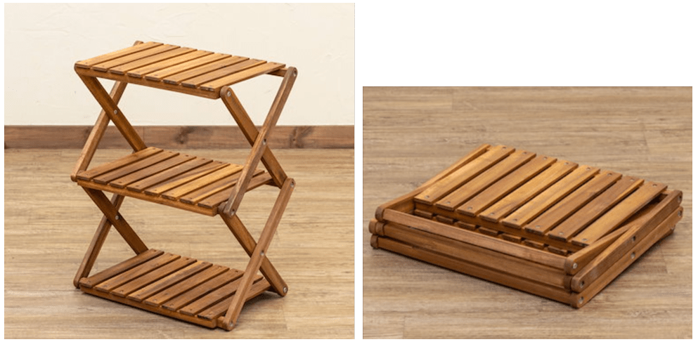 折りたたみラックはキャンプの定番アイテム。テーブルに置くとごちゃつくカトラリー、ライト、スパイスなどの置き場にできるため、毎回室内に物を取りに行く手間も省ける。使用しない時は折りたたんでコンパクトに収納可能。