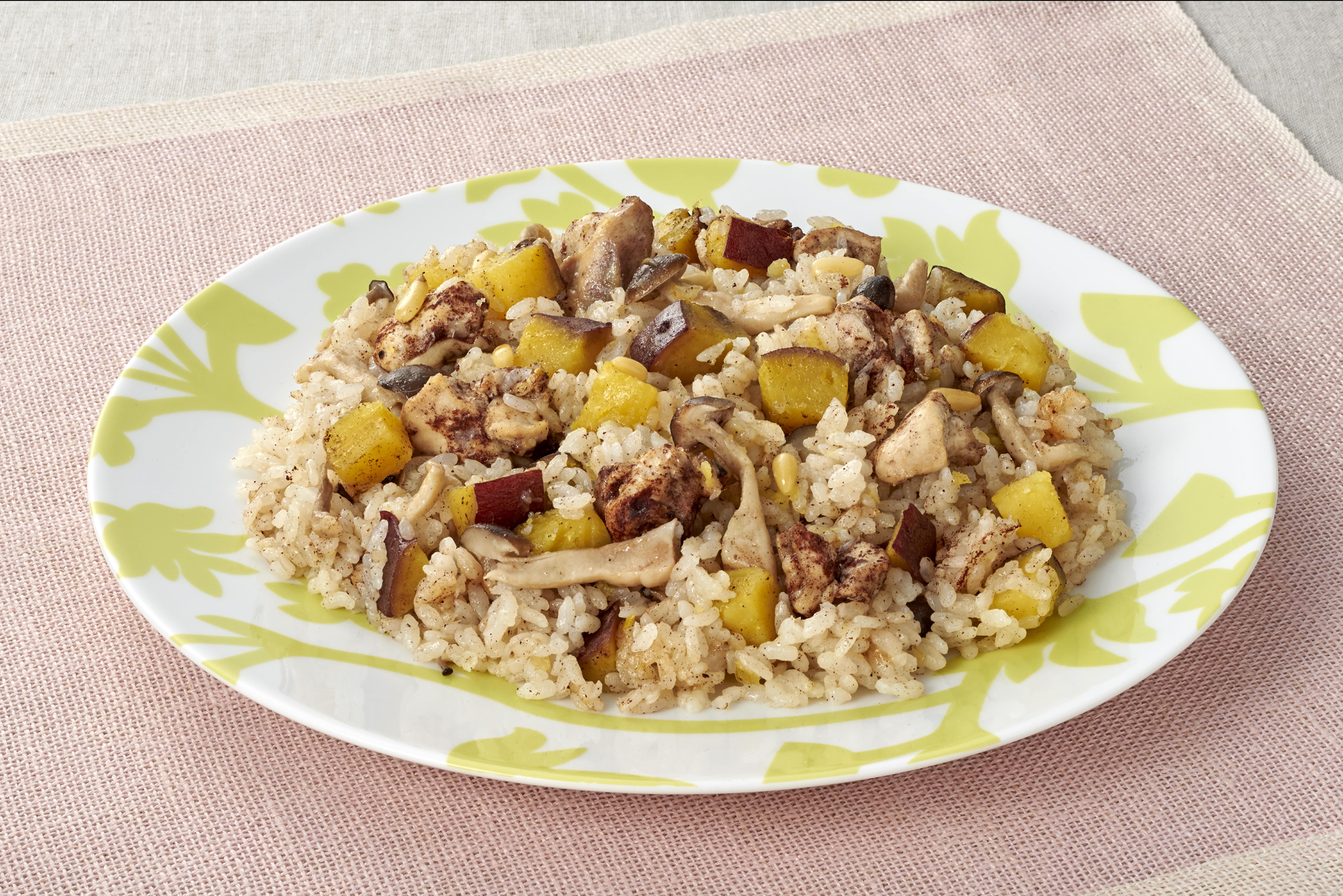 ②炊飯器に米、水、コンソメ、塩、コショーを入れて混ぜる。上に鶏肉、さつまいも、玉ねぎ、しめじ、松の実をのせて炊飯する。