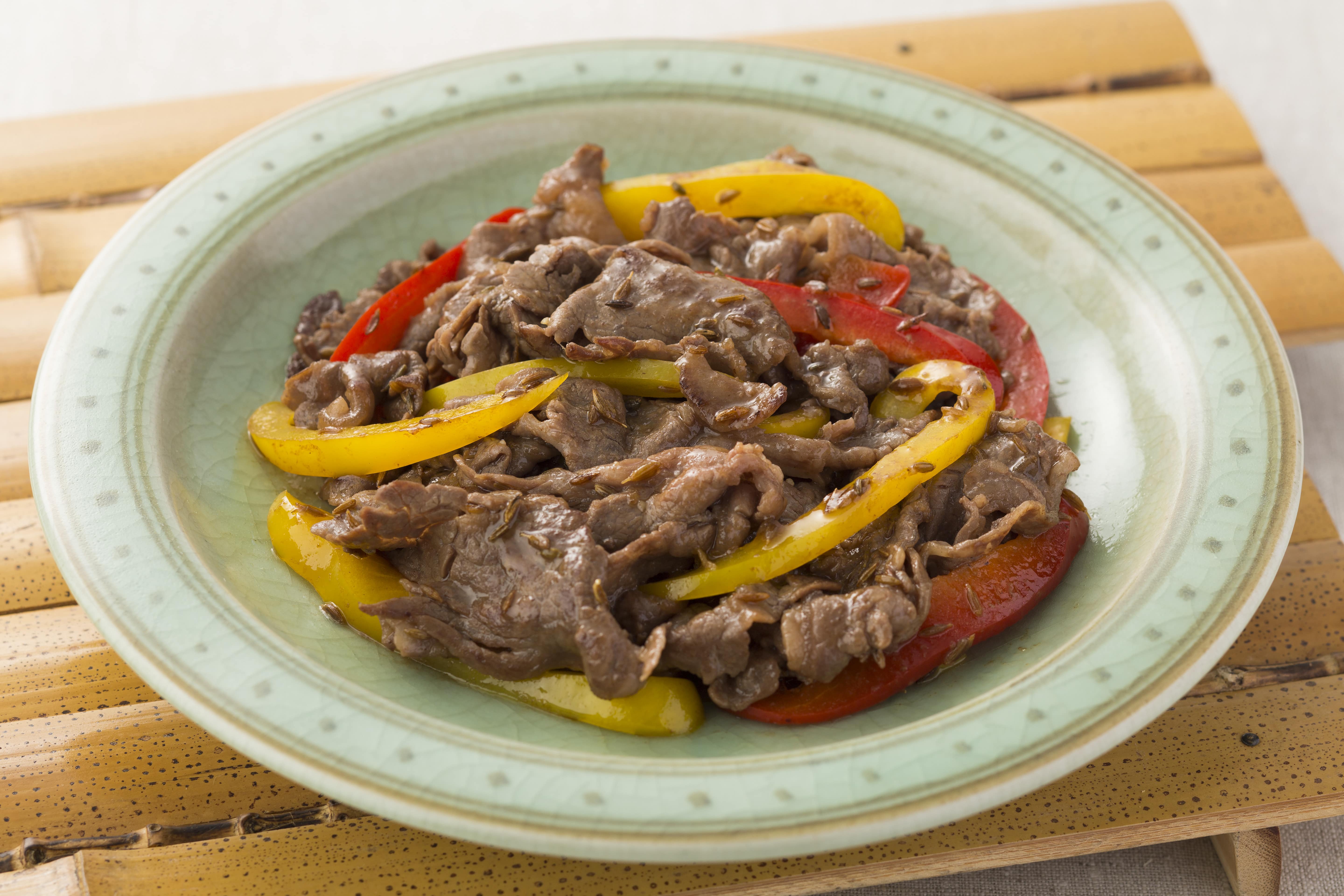 ②フライパンにサラダ油を入れて火にかけ、2、3粒のクミンシードを加え、周囲に細かい泡が出るようになったら残りのクミンシードを入れて、焦げないよう注意して炒める。クミンの香りが立ってきたら牛肉を加え、肉の色が変わったら、赤パプリカ、黄色パプリカを入れ炒める。