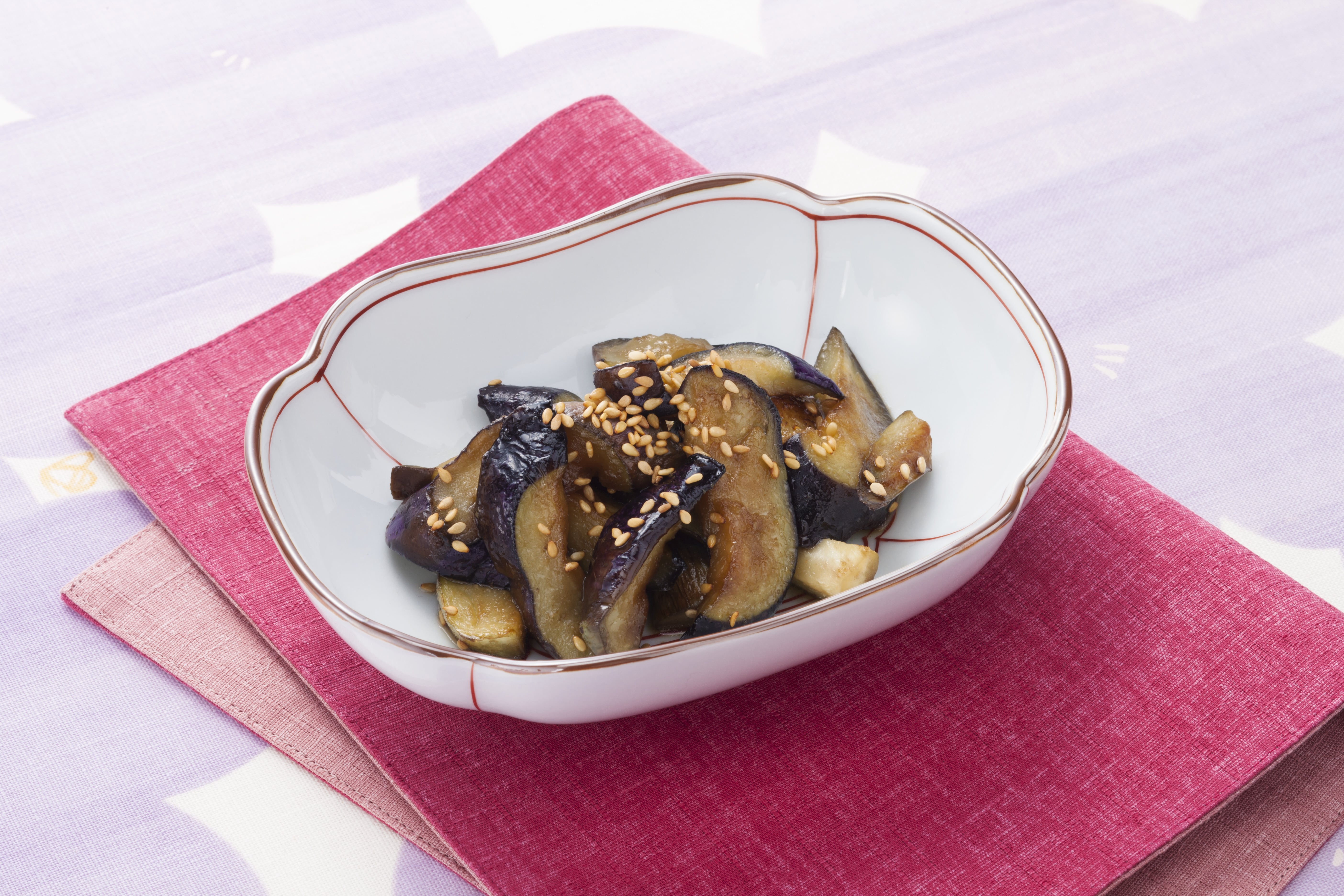 ①なすはヘタを除いて縦半分に切り、1cm幅の斜め切りにする。水にさら