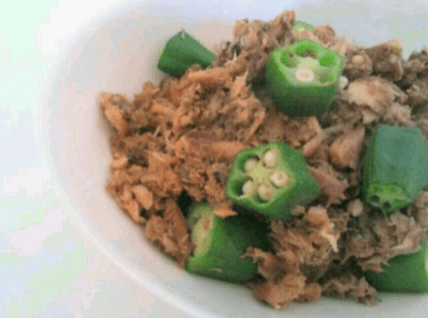 ①鍋に油をひき、オクラを軽く炒める。軽く身をほぐしたサバ缶を入れ、強火で炒める。身が乾かないように、途中で缶に残ってる汁を加える。