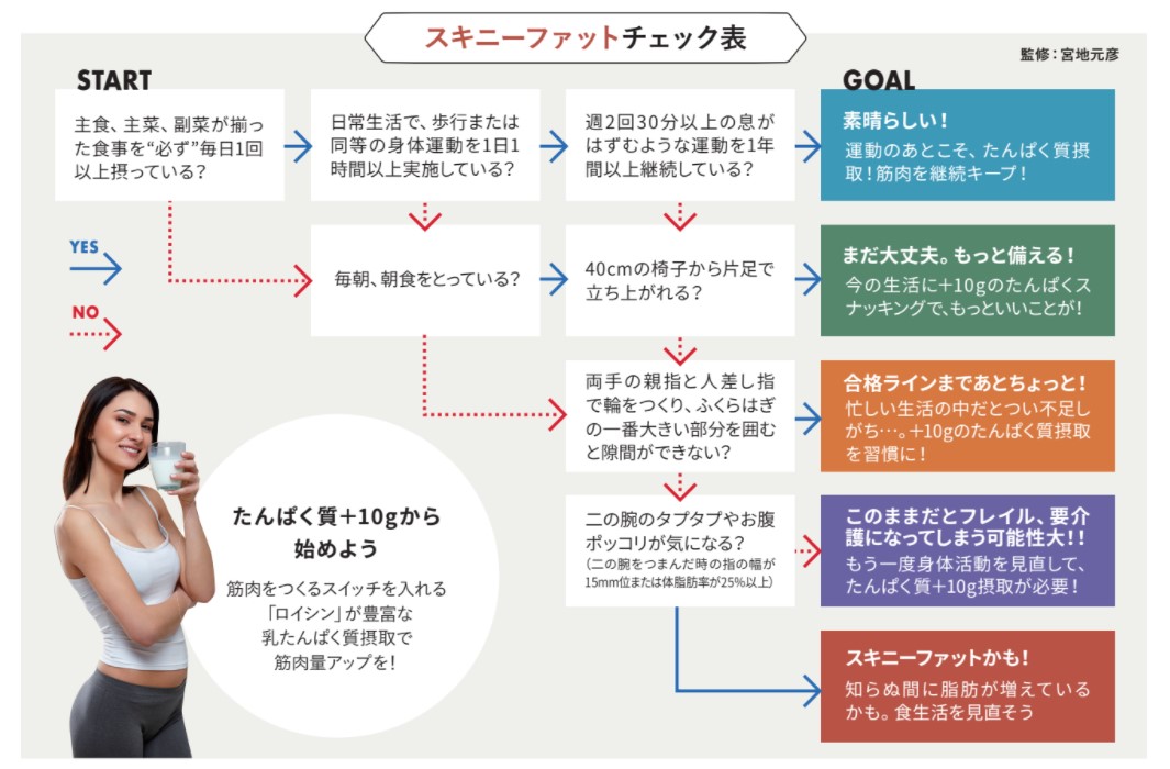 スキニーファットを解消または予防するためには、筋肉を増やすことです。そのためには、運動のほかに、筋肉をつくる元となるたんぱく質を十分摂取することが必要だと言われています。