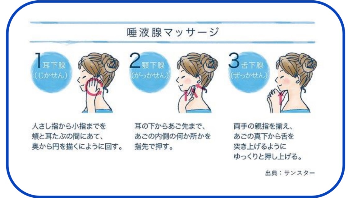 生理的な口臭、病的な口臭に関わらず、口臭の原因には口の乾燥が大きく関わっています。食事をするときはしっかり噛んで唾液の分泌を促すほか、顎から胸にかけてある唾液腺のマッサージも有効です。