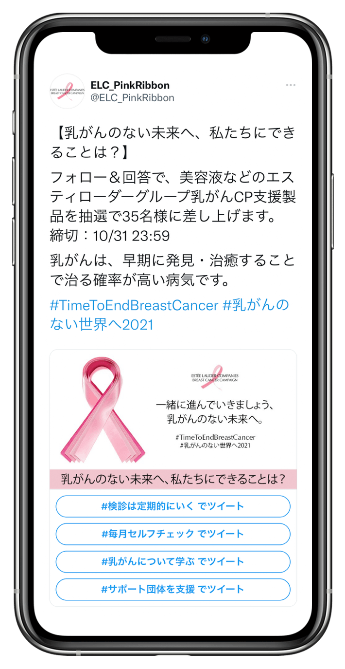 乳がんに関する知識や、乳がんのセルフチェックの方法をTwitter上でシェアできるキャンペーンです。本キャンペーンに参加した方の中から抽選で35名様に、キャンペーン支援製品をプレゼントしています。