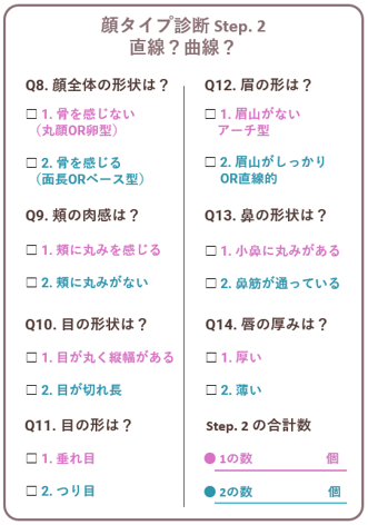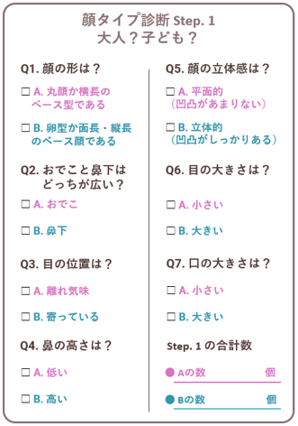 診断1のA・B、診断2の1・2のどちらが多かったかで、あなたのフェイスタイプを導き出していきます。