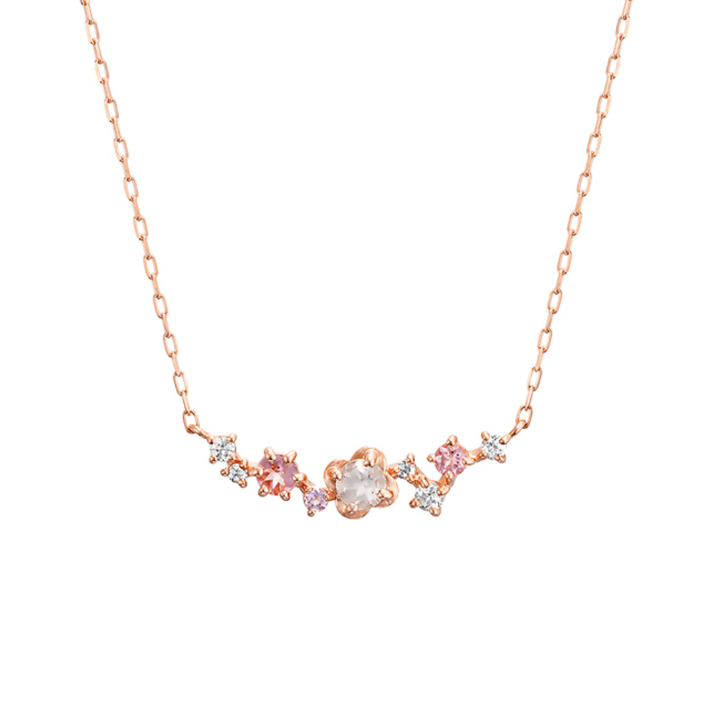 フラワーモチーフを中心に、ローズクォーツやアメシストがデコルテに沿って煌めき、上品さを演出するネックレス。主張しすぎないカラーストーンが甘すぎず大人可愛い印象に仕上げてくれます。