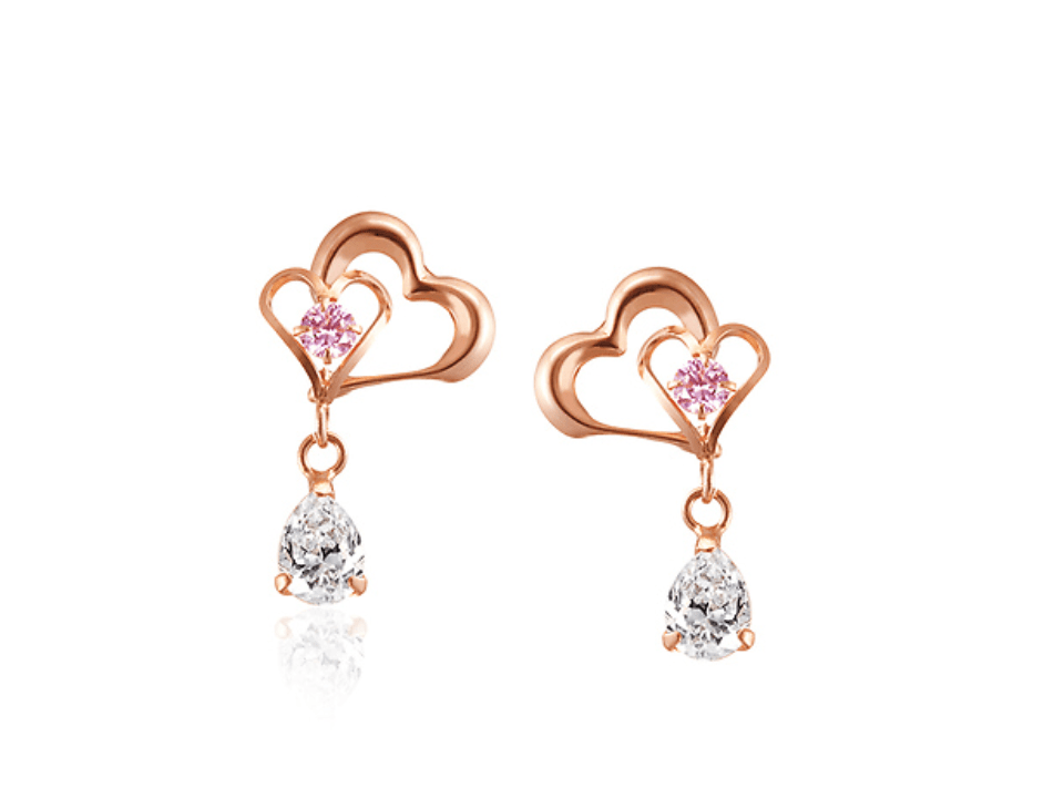 繊細なラインのハートが重なり合う、キュートさんらしい可憐な印象のピアス。しずく型のキュービックジルコニアが、揺れながら眩い輝きを放ち、愛らしい耳元に。