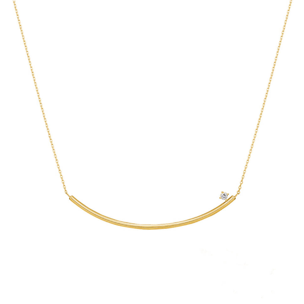 エローゴールドの横長ラインが美しいネックレス。さりげなく添えたダイヤモンドが煌めき、カジュアルながらしっかりとした存在感でフレッシュさんの雰囲気にマッチ。