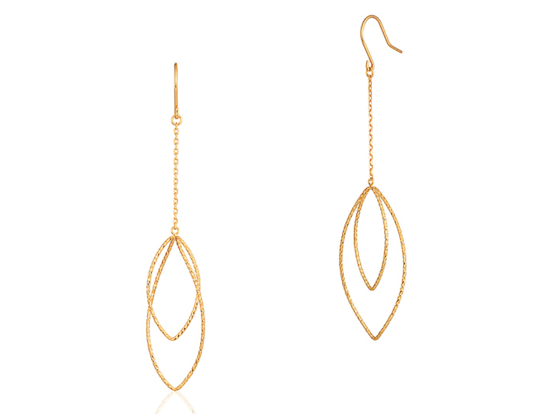 楕円のフープデザインがスタイリッシュで、揺れる度に表情豊かに煌めくロングピアス。イエローゴールドの華やかな色合いも、クールさんの美しさを一層引き立ててくれる。
