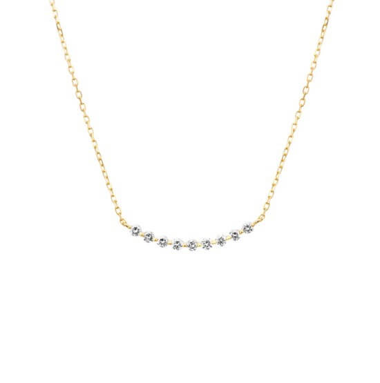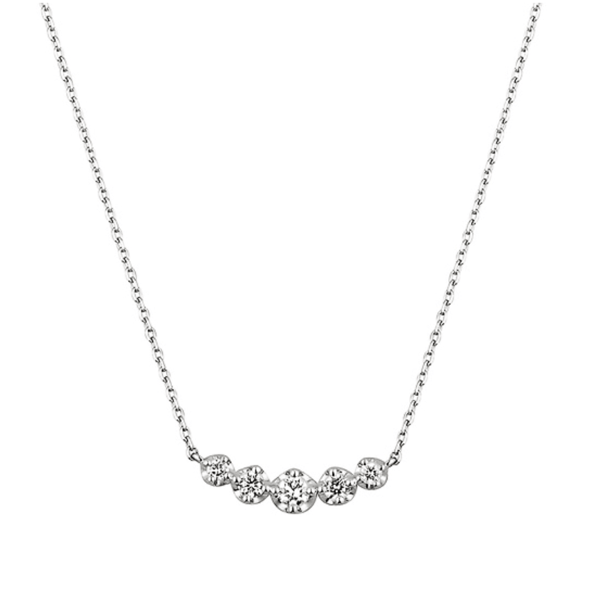 デコルテに沿って5粒のダイヤが並べられた、シンプルながらも存在感抜群のネックレス。ダイヤモンド×プラチナの煌めきは、気品漂う胸元に。