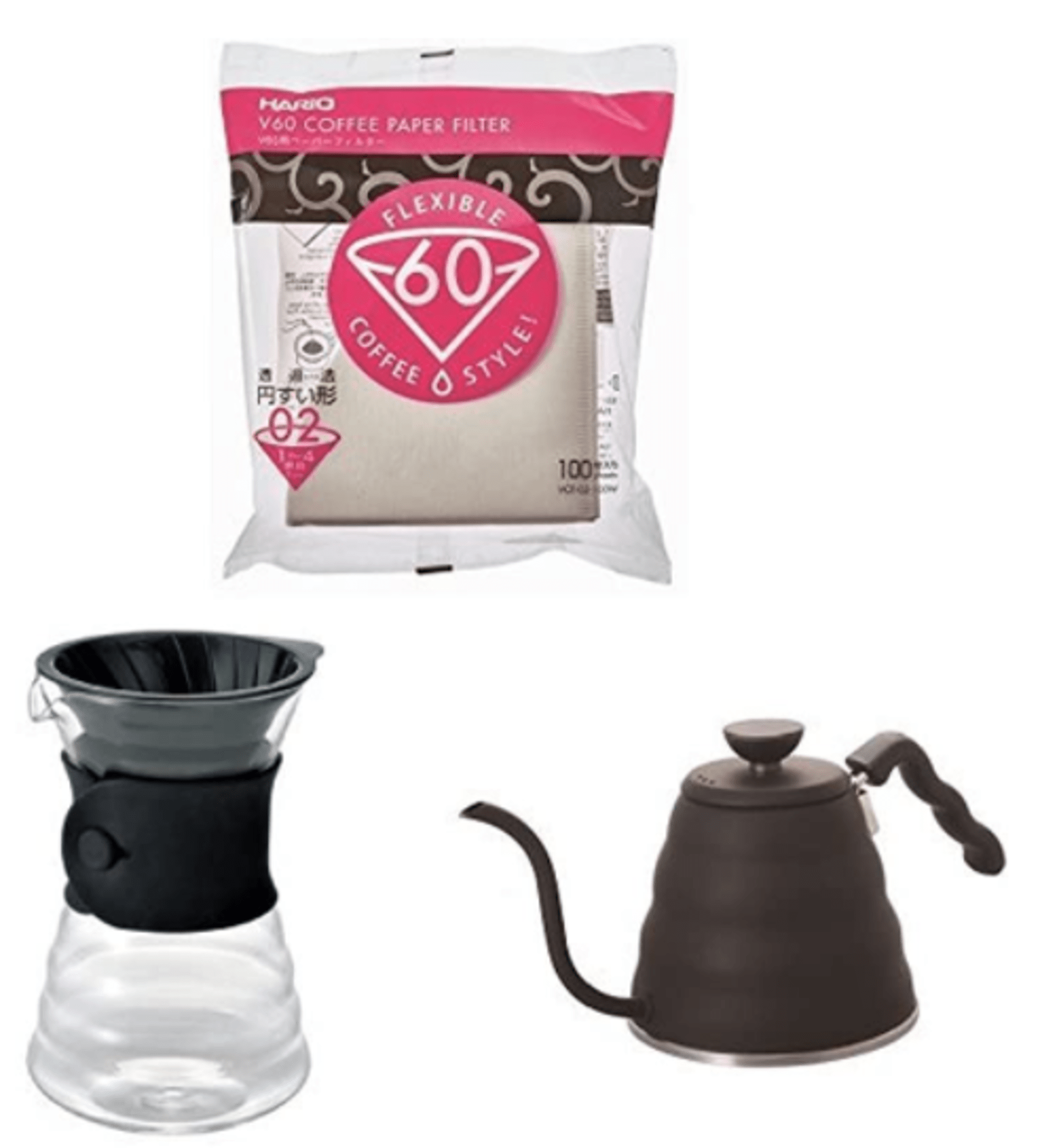 けんけんさんも自分でコーヒーを淹れ始めたときに使用していた、ドリップデカンタ、ケトル、フィルターの3点セット。