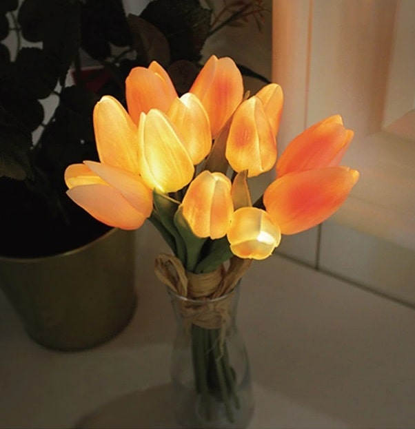 生花のような質感と香りを持つ乾電池式のランプ。ピンクやオレンジなど4種類のカラーから選択可能。