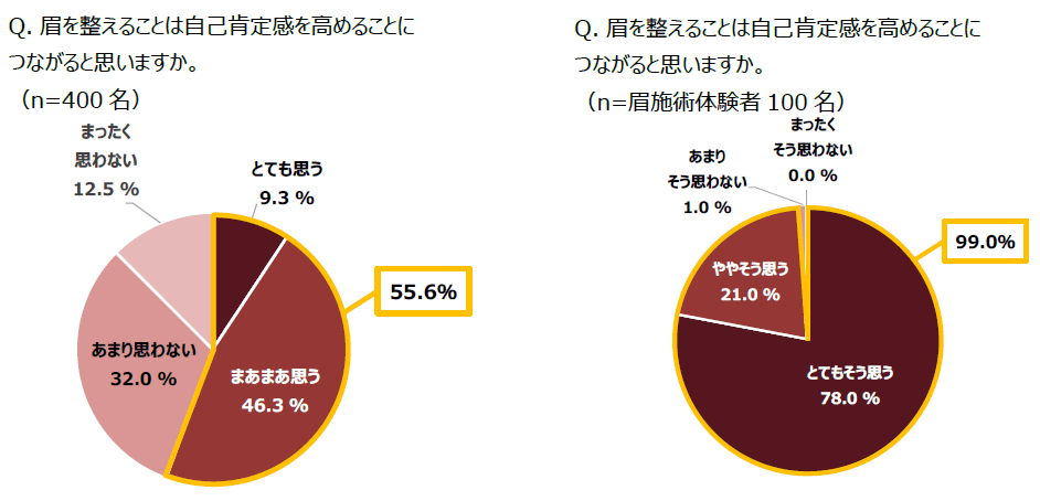 一方、眉施術体験者の 100 人はほぼ全員が「眉を整えることで自己肯定感が高まると思う」と回答する結果となりました。