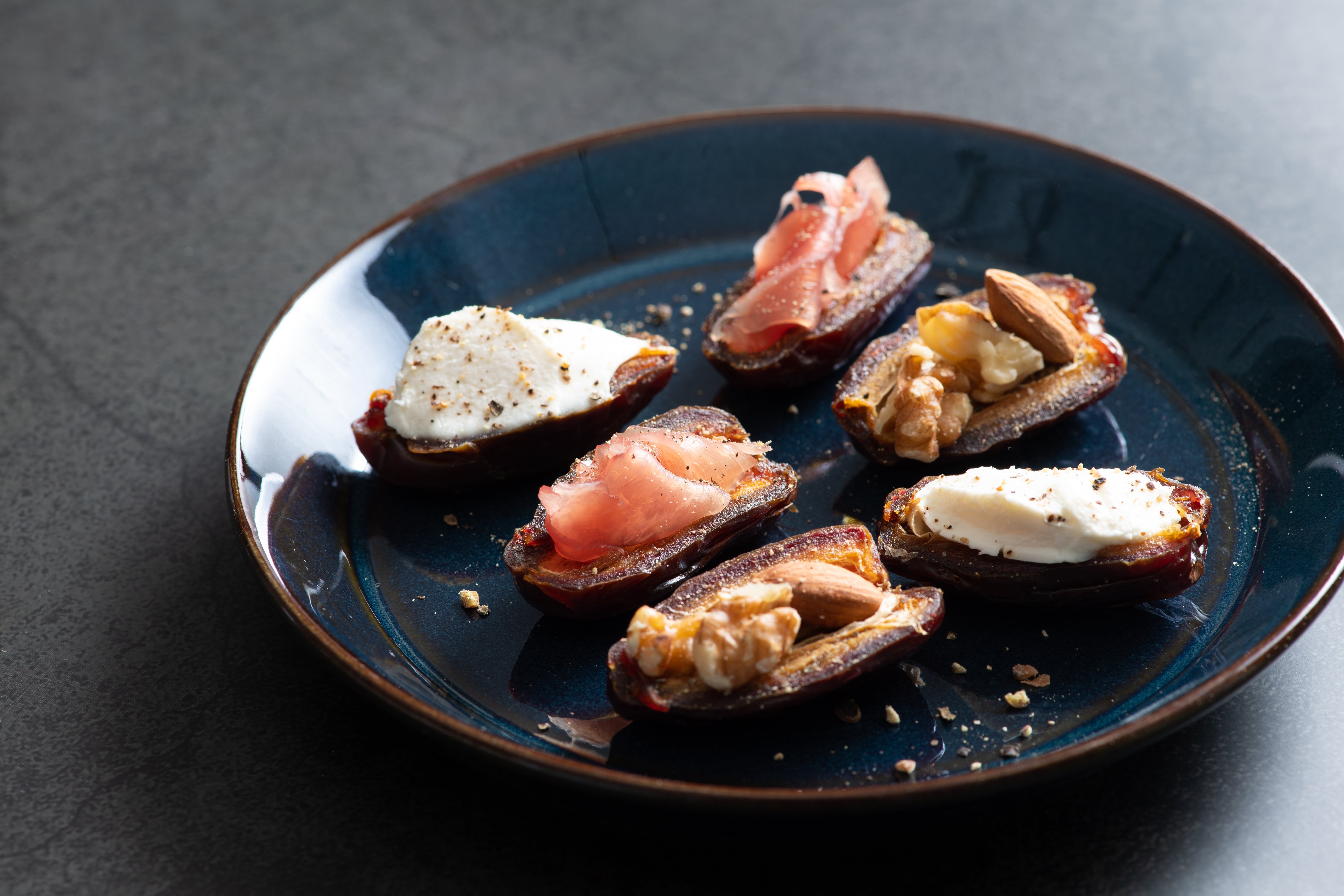 デーツを割って、お好みの食材をトッピングするだけのお手軽メニュー。ワインのお供やちょっとした間食にもぴったりです。