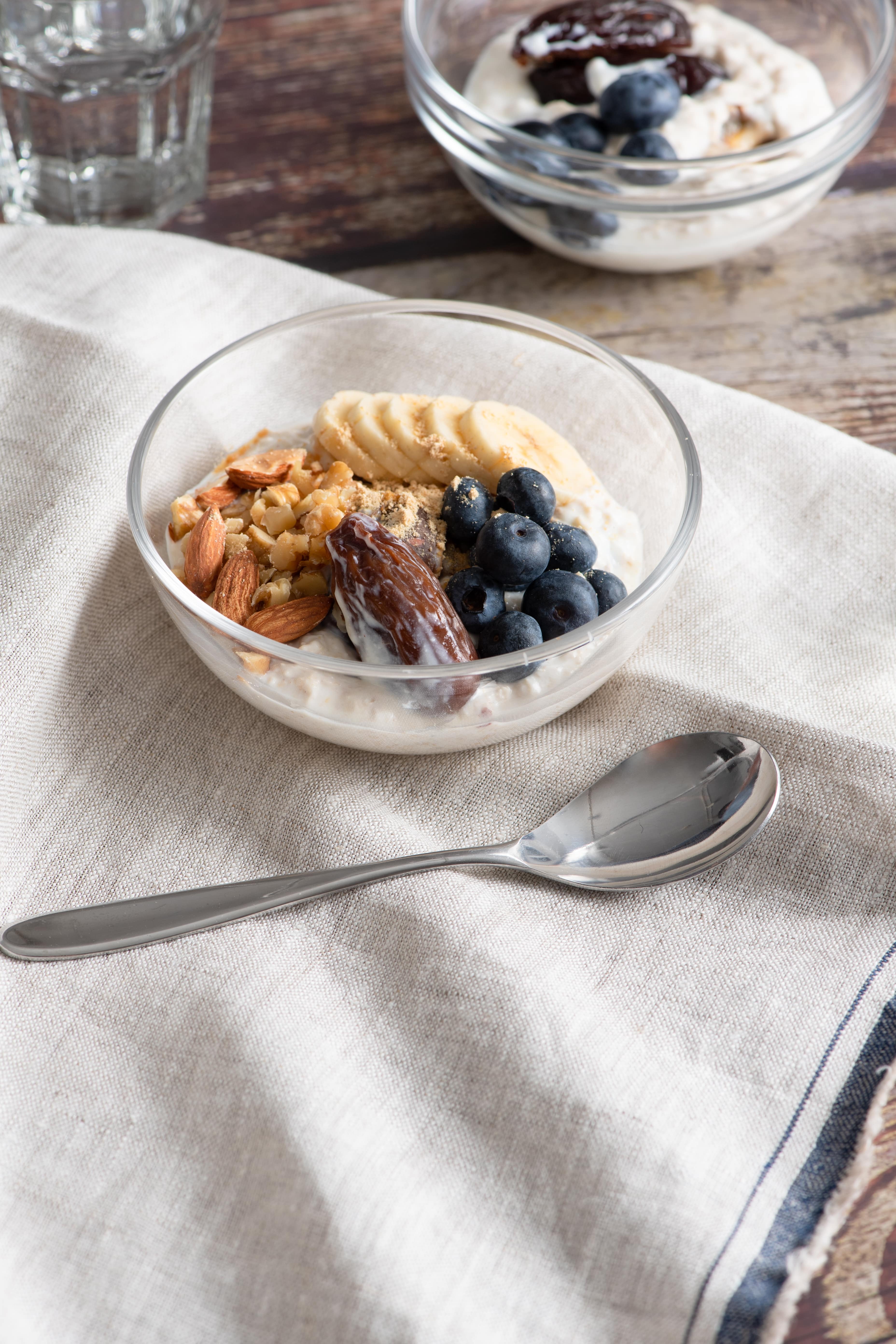 デーツとオートミールの食物繊維とヨーグルトの乳酸菌の組み合わせで、腸内環境を整えるメニューです。タンパク質やビタミンを含む食材をトッピングすれば、朝食にもぴったり。