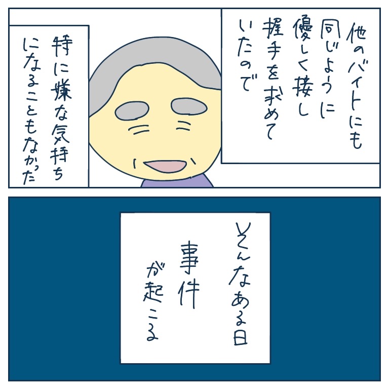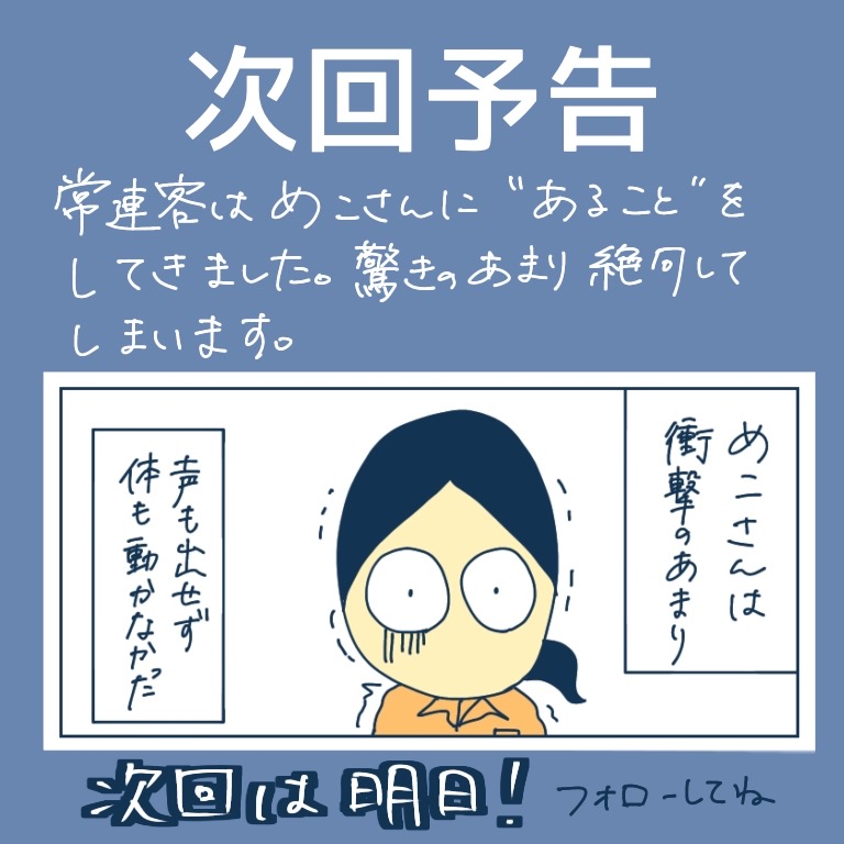 職場の優しい常連さんが出禁になった話2【稲漫画】 オリジナル漫画 2025年4月1日 ▼前回のお話はこちら 職場の優しい常連さんが出禁になった話1【稲漫画】 優しい声掛けをしてくれるバイト先の常連さんの話©稲 ▼続きはこちら 職場の優しい常連さんが出禁になった話3【稲漫画】 優しい声掛けをしてくれるバイト先の常連さんの話©稲 こちらのLovely漫画もおすすめ! いつも支えてくれる大切な人【Lovely漫画】 彼女持ちの彼に一目惚れ。彼女と別れてご飯に行けたのに…©ぴまを/エピソード:すなぎも 二人だけの秘密【Lovely漫画】 好きな人の隣になれた!嬉しいことはそれだけじゃなくて…©つき/エピソード:ひな 反則だよ…距離感が近すぎる!【Lovely漫画】 好きな人のせいでドキドキがいつも止まりませんっ©くれ太/エピソード:匿名 ライター 稲 エッセイ漫画を描くサラリーウーマン!Instagram【@inasan_mainichi】 目次Related article / 関連記事 オリジナル漫画 メンヘラ彼氏にサヨナラ【Lovely漫画】 ©みんみ 2022年3月29日 オリジナル漫画 年下イケメン彼氏に翻弄されるオンナの毎日#3【Lovely漫画】 ©みんみ 2022年3月29日 オリジナル漫画 2人暮らしのゆる家事日記~気まぐれ旦那の献立作りの巻き~後編【Lovely漫画】 ©みんみ 2022年3月29日 オリジナル漫画 年下イケメン彼氏に翻弄されるオンナの毎日#1【Lovely漫画】 ©みんみ「初めての○○の話 前編」 2022年3月29日 オリジナル漫画 年下イケメン彼氏に翻弄されるオンナの毎日#2【Lovely漫画】 ©みんみ「初めての○○の話 後編」 2022年3月29日 オリジナル漫画 よかったらシェアしてね! URLをコピーしました! URLをコピーしました! 不幸アピールする後輩にウンザリ19【稲漫画】 不幸アピールする後輩にウンザリ22【稲漫画】