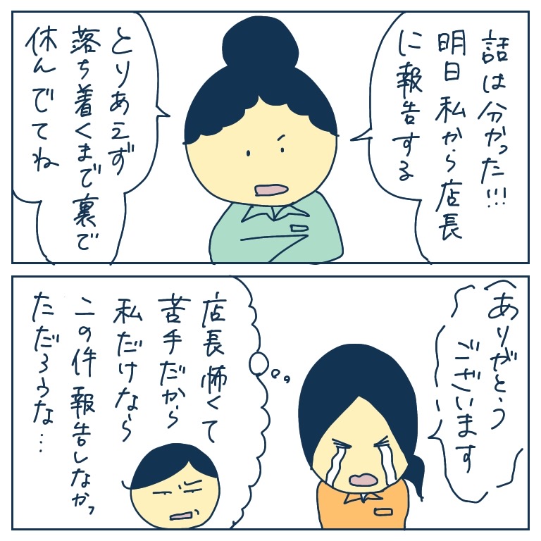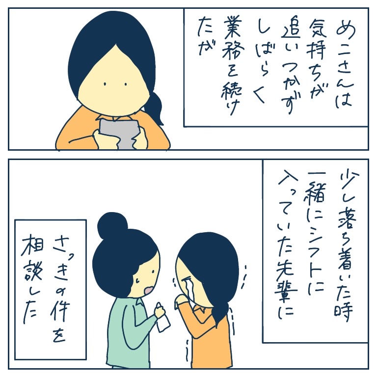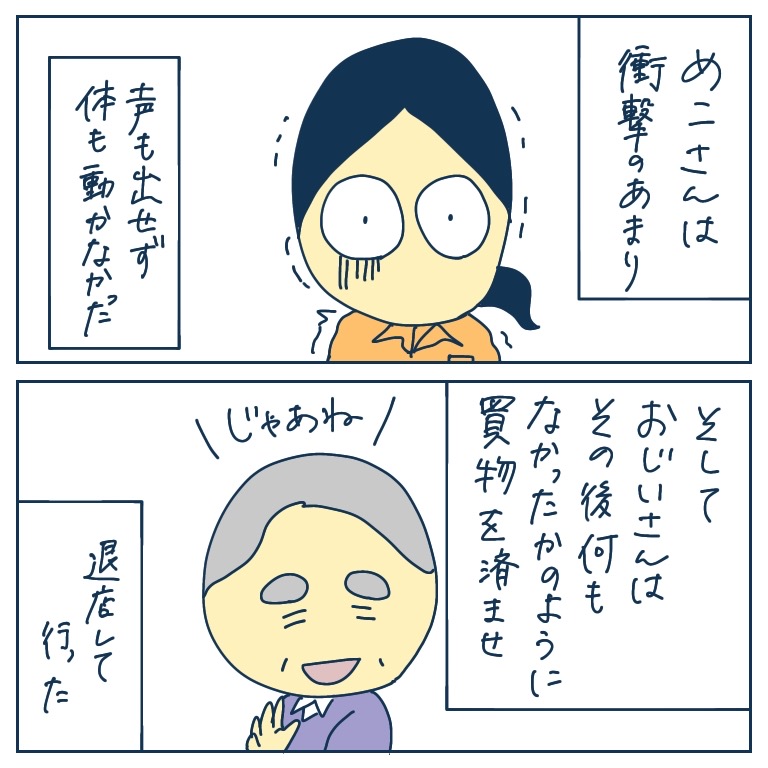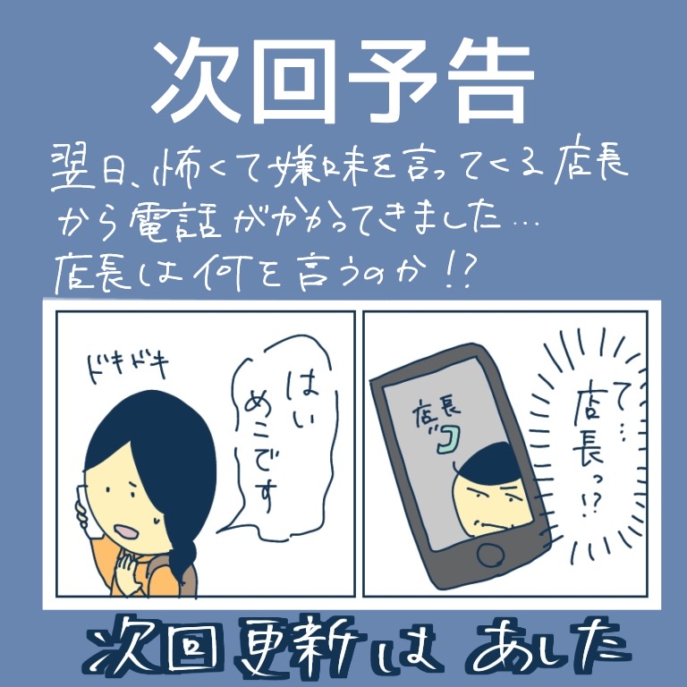 職場の優しい常連さんが出禁になった話3【稲漫画】 オリジナル漫画 2025年4月1日 ▼前回のお話はこちら 職場の優しい常連さんが出禁になった話2【稲漫画】 優しい声掛けをしてくれるバイト先の常連さんの話©稲 ▼続きはこちら 職場の優しい常連さんが出禁になった話4【稲漫画】 優しい声掛けをしてくれるバイト先の常連さんの話©稲 こちらのLovely漫画もおすすめ! 里中さんと山内くんの両片想い【Lovely漫画】 告白しようと思うもいつも失敗してしまう里中さんと、勇気を出せずにいる山内くんの、初々しい短編連載スタート!©azusa 学校イチかっこいい友達【Lovely漫画】 恋愛感情のない良き友達だけど…思わずきゅん♡©ちビ/エピソード:ミニー 席替えの奇跡【Lovely漫画】 アイドル的存在の気になる彼と私のささやかな幸せの話©サクライさんオリジナルストーリー! ライター 稲 エッセイ漫画を描くサラリーウーマン!Instagram【@inasan_mainichi】 目次Related article / 関連記事 オリジナル漫画 メンヘラ彼氏にサヨナラ【Lovely漫画】 ©みんみ 2022年3月29日 オリジナル漫画 年下イケメン彼氏に翻弄されるオンナの毎日#3【Lovely漫画】 ©みんみ 2022年3月29日 オリジナル漫画 2人暮らしのゆる家事日記~気まぐれ旦那の献立作りの巻き~後編【Lovely漫画】 ©みんみ 2022年3月29日 オリジナル漫画 年下イケメン彼氏に翻弄されるオンナの毎日#1【Lovely漫画】 ©みんみ「初めての○○の話 前編」 2022年3月29日 オリジナル漫画 年下イケメン彼氏に翻弄されるオンナの毎日#2【Lovely漫画】 ©みんみ「初めての○○の話 後編」 2022年3月29日 オリジナル漫画 よかったらシェアしてね! URLをコピーしました! URLをコピーしました! 不幸アピールする後輩にウンザリ19【稲漫画】 不幸アピールする後輩にウンザリ22【稲漫画】