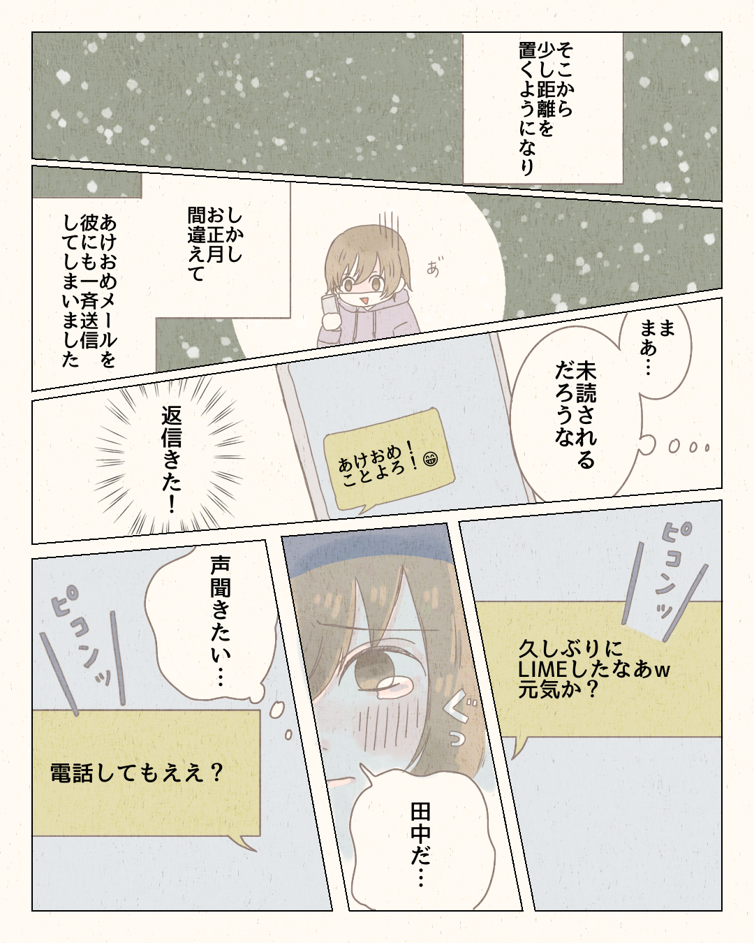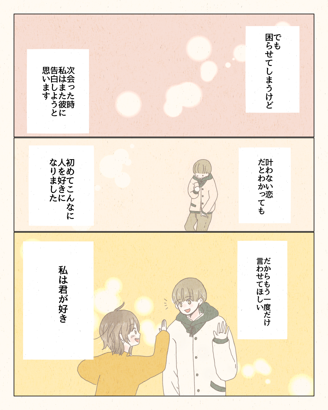 やっぱりまだ、君が好き【Lovely漫画】 オリジナル漫画 2024年10月23日 目次 なぁさんの作品をもっと読む! なぁさんの作品一覧【Lovely漫画】 なぁさんの人気作をおまとめしています! こちらのLovely漫画もおすすめ 10年越しの両想い【Lovely漫画】 小学生のとき素直になれず後悔をしてから10年…成人式をきっかけにー…©倖/エピソード:ちゃんちゃん クリスマスプレゼント【Lovely漫画】 1年前のクリスマス、私は運命の人に出会いました。しかし、彼の第一印象は最悪で…!?©yuzuna/エピソード:あき 語学留学で、イギリス人と。【Lovely漫画】 留学先のロンドンで、不思議とずっと昔からの知り合いかのような彼に出会いました。©サクライ/エピソード:むーこ 片想いの独り言【Lovely漫画】 今日は、大好きなあなたに向けて手紙を書いてみようと思います。©望月悠/エピソード:りく ライター Lovely編集部 編集部レポや最新情報など皆さんの「知りたい」をお届け!よろしくお願いします♡ Related article / 関連記事 オリジナル漫画 メンヘラ彼氏にサヨナラ【Lovely漫画】 ©みんみ 2022年3月29日 オリジナル漫画 年下イケメン彼氏に翻弄されるオンナの毎日#3【Lovely漫画】 ©みんみ 2022年3月29日 オリジナル漫画 2人暮らしのゆる家事日記~気まぐれ旦那の献立作りの巻き~後編【Lovely漫画】 ©みんみ 2022年3月29日 オリジナル漫画 年下イケメン彼氏に翻弄されるオンナの毎日#1【Lovely漫画】 ©みんみ「初めての○○の話 前編」 2022年3月29日 オリジナル漫画 年下イケメン彼氏に翻弄されるオンナの毎日#2【Lovely漫画】 ©みんみ「初めての○○の話 後編」 2022年3月29日 1 2 オリジナル漫画 よかったらシェアしてね! URLをコピーしました! URLをコピーしました! ヤベェ同期に困ってます!!41【稲漫画】 【前髪クリップ】って知ってる?便利な使い方とおすすめまとめ!