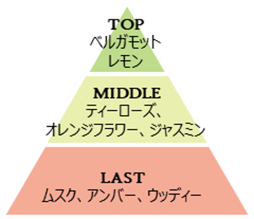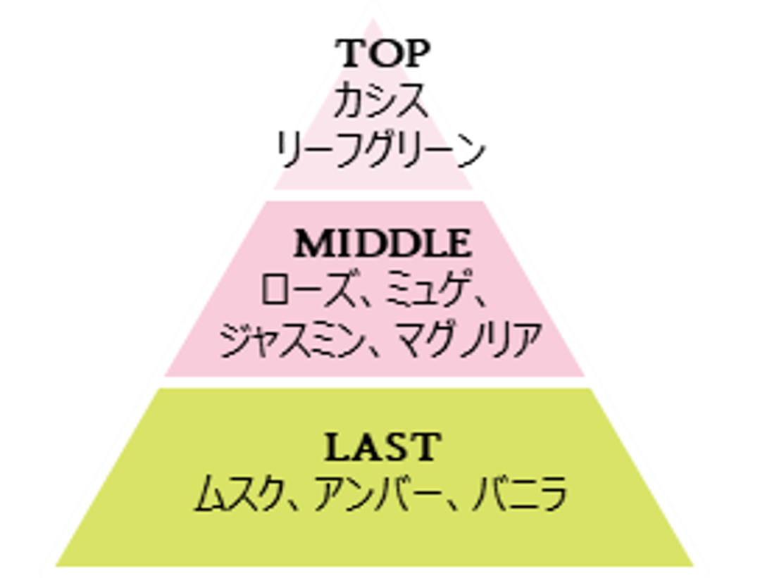 フェミニンで明るい香り。さっぱりとした爽やかな香りから、深く甘くなっていく、香りの変化の大きさが特徴的。