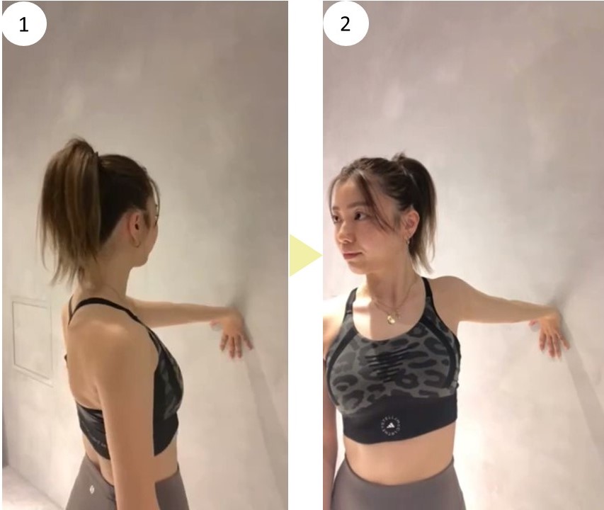1壁に向かって手のひらをつけます。この時手は肩よりも下の位置に、指先が下になるようにしてください。