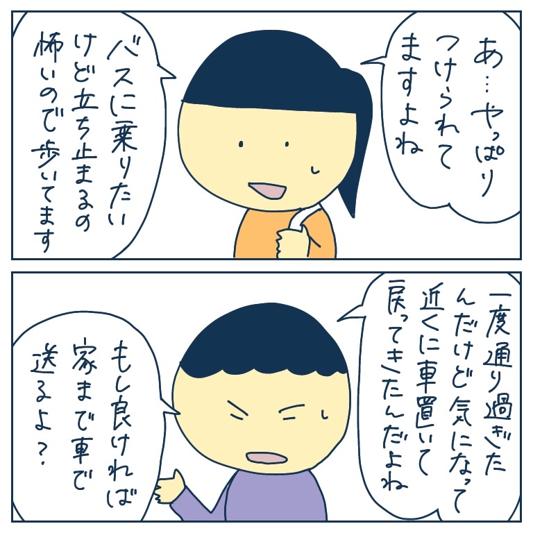 巧妙な手口 ストーカーから助けてくれた人2【稲漫画】 オリジナル漫画 2025年4月1日 ▼前回のお話はこちら 巧妙な手口 ストーカーから助けてくれた人1【稲漫画】 女性の一人歩きはご用心!仕事帰りに後を付けられた女性が経験した恐怖体験。 稲さんの他連載はコチラ 小学6年生が体験した恐怖の話!©稲 こちらのLovely漫画もおすすめ 彼氏のことが好きかわからない…。電話占い「みん電占い」の診断結果は?[PR] 最近、彼氏との時間が楽しくない…好きじゃないのかな?電話占いの『みんなの電話占い』は8万件以上の口コミや占い師の先生との実際の会話まで見れる体験談も豊富だから安心です。さらに、Lovelyサイトから登録した方限定で、初回3000円オフクーポンをプレゼント! ライター 稲 エッセイ漫画を描くサラリーウーマン!Instagram【@inasan_mainichi】 目次Related article / 関連記事 オリジナル漫画 メンヘラ彼氏にサヨナラ【Lovely漫画】 ©みんみ 2022年3月29日 オリジナル漫画 年下イケメン彼氏に翻弄されるオンナの毎日#3【Lovely漫画】 ©みんみ 2022年3月29日 オリジナル漫画 2人暮らしのゆる家事日記~気まぐれ旦那の献立作りの巻き~後編【Lovely漫画】 ©みんみ 2022年3月29日 オリジナル漫画 年下イケメン彼氏に翻弄されるオンナの毎日#1【Lovely漫画】 ©みんみ「初めての○○の話 前編」 2022年3月29日 オリジナル漫画 年下イケメン彼氏に翻弄されるオンナの毎日#2【Lovely漫画】 ©みんみ「初めての○○の話 後編」 2022年3月29日 オリジナル漫画 よかったらシェアしてね! URLをコピーしました! URLをコピーしました! 不幸アピールする後輩にウンザリ19【稲漫画】 不幸アピールする後輩にウンザリ22【稲漫画】