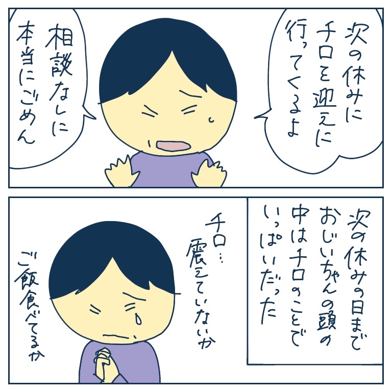 野良犬チロとおじいちゃん3【稲漫画】 オリジナル漫画 2022年10月3日 ▼前回のお話はこちら 野良犬チロとおじいちゃん2【稲漫画】 フォロワーさんのおじいちゃんが若いころに見つけた野良犬の話©稲 稲さんの連載一覧はこちら 毎日更新!サラリーウーマン稲のエッセイ漫画 毎日更新!サラリーウーマン稲のエッセイ漫画 こちらのLovely漫画もおすすめ 私の青春は君がすべて【Lovely漫画】 高校三年間、同じクラスだった彼とは男女でも仲の良い友達。ある日、学校で勉強を教えていると…©倖/エピソード:りり 好きでいられる自信があるから【Lovely漫画】 周りよりも大人びていて好きな人が出来なかった私。そんな私が高校で出会った成績優秀な彼に少しづつ惹かれて…©ナナ/エピソード:あいうた 既婚者男性が職場で好きな女性にとる態度って?不倫の相談なら「みん電占い」[PR] 好きな人が既婚者で、恋愛の相談が誰にもできない…、既婚男性が職場で好きな女性にとる態度や気持ちが知りたい、そんな方には「みんなの電話占い」がおすすめ!8万件以上の口コミや占い師の先生との実際の会話まで見れる体験談も豊富で安心。さらに、Lovelyサイトから登録した方限定で、初回3000円オフクーポンをプレゼント! ライター 稲 エッセイ漫画を描くサラリーウーマン!Instagram【@inasan_mainichi】 目次Related article / 関連記事 オリジナル漫画 メンヘラ彼氏にサヨナラ【Lovely漫画】 ©みんみ 2022年3月29日 オリジナル漫画 年下イケメン彼氏に翻弄されるオンナの毎日#3【Lovely漫画】 ©みんみ 2022年3月29日 オリジナル漫画 2人暮らしのゆる家事日記~気まぐれ旦那の献立作りの巻き~後編【Lovely漫画】 ©みんみ 2022年3月29日 オリジナル漫画 年下イケメン彼氏に翻弄されるオンナの毎日#1【Lovely漫画】 ©みんみ「初めての○○の話 前編」 2022年3月29日 オリジナル漫画 年下イケメン彼氏に翻弄されるオンナの毎日#2【Lovely漫画】 ©みんみ「初めての○○の話 後編」 2022年3月29日 オリジナル漫画 よかったらシェアしてね! URLをコピーしました! URLをコピーしました! 束縛男の恐怖2【Lovely漫画】 あなたは本当に私の知り合い?2【稲漫画】
